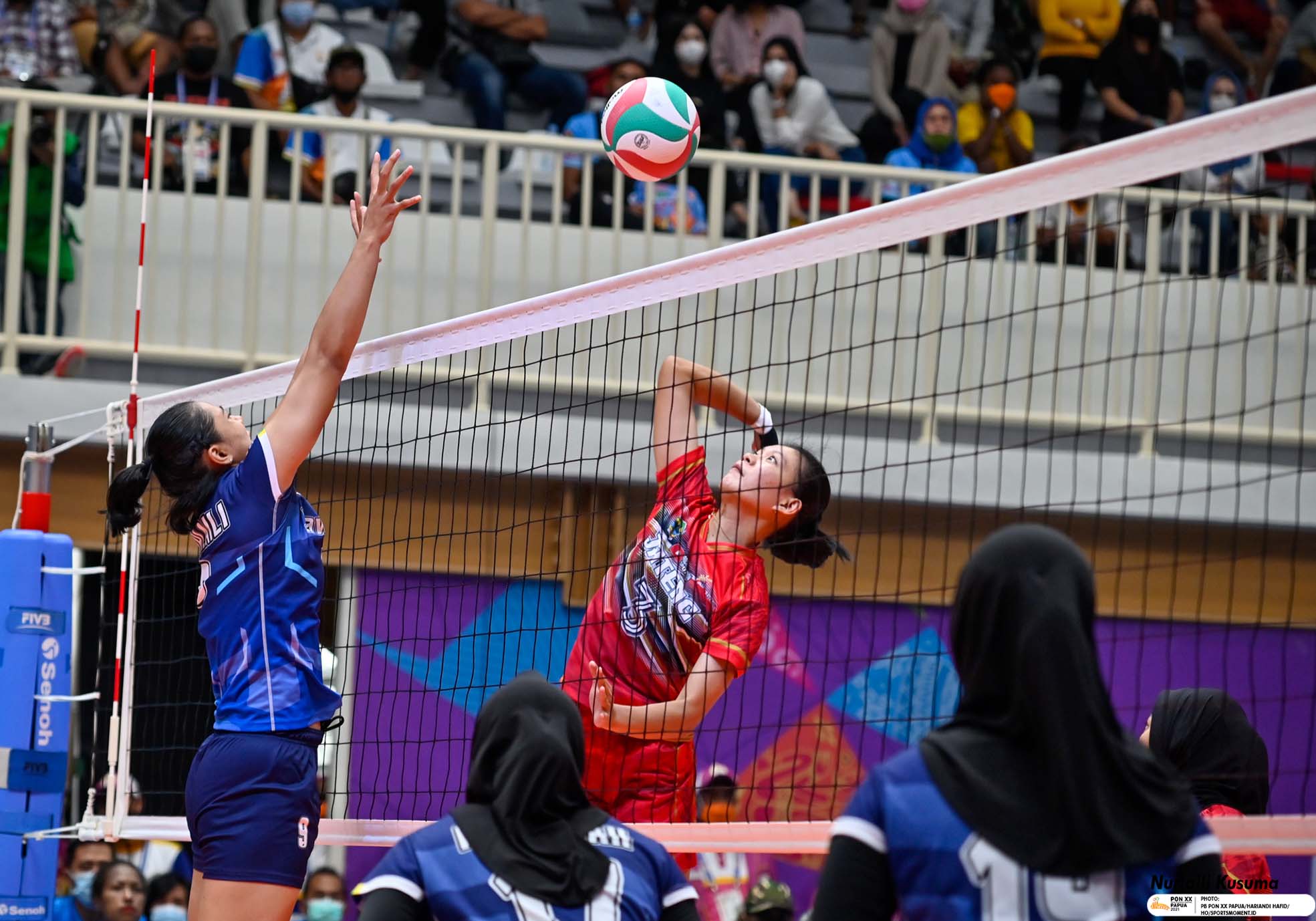 Pemain Jawa Barat Nurlaili Kusuma Diningrat berusaha memblok spike yang dilakukan pemain Jawa Tengah Pratiwi saat laga final Bola Voli Putri PON XX Papua di GOR Voli Indoor Koya Koso, Kota Jayapura, Papua, Selasa (12/10/2021). Laga ini dimenangkan oleh tim …