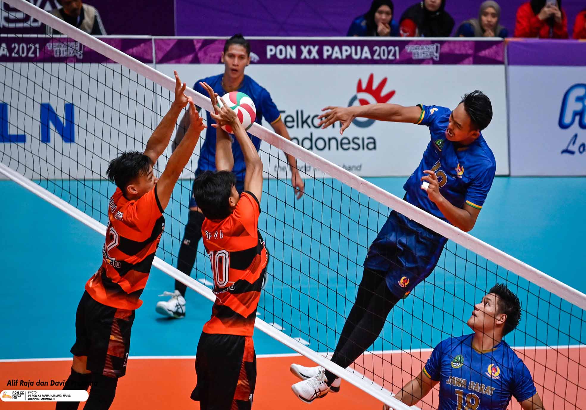 Pemain DKI Jakarta Alif Raja BUrrahman dan David Pratama berusaha memblok spike yang dilakukan pemain Jawa Barat , Cep Indra Agustin saat laga final Bola Voli Putra PON XX Papua di GOR Voli Indoor Koya Koso, Kota Jayapura, Papua, Selasa (12/10/2021).