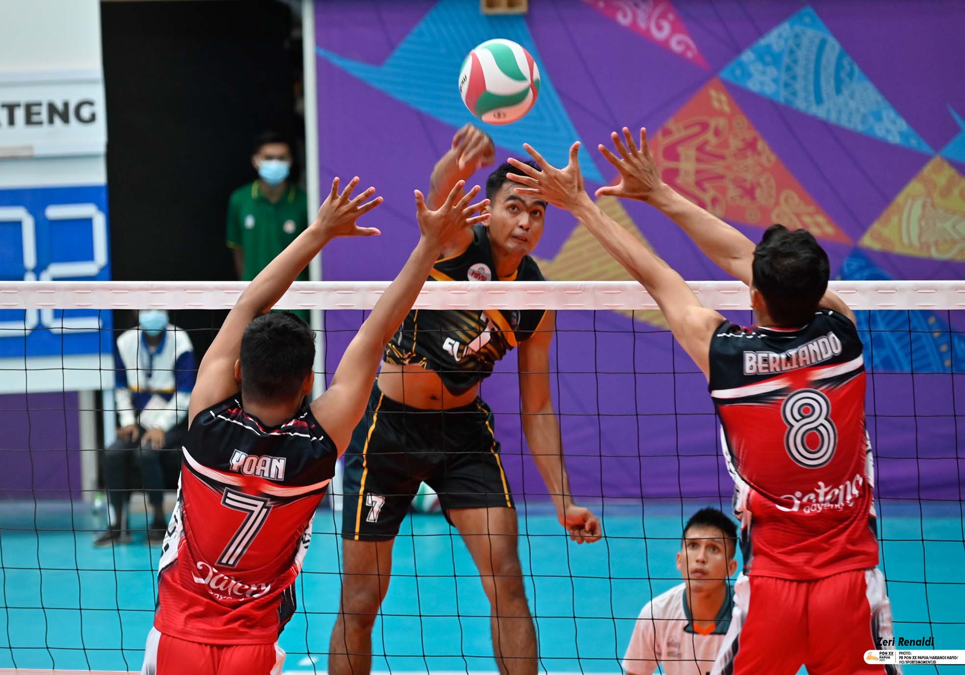 Pebola voli Sumatera Utara Zeri Renaldi melakukan smes ke arah sisi lapangan tim Jawa Tengah pada penyisihan grup Bola Voli Putra PON Papua di GOR Voli Indoor Koya Koso, Kota Jayapura, Papua, Minggu (03/09/2021). Tim bola voli putra jawa tengah berhasil mengalahkan Sumatera Utara dengan skor 25-20, 25-18, 25-23.