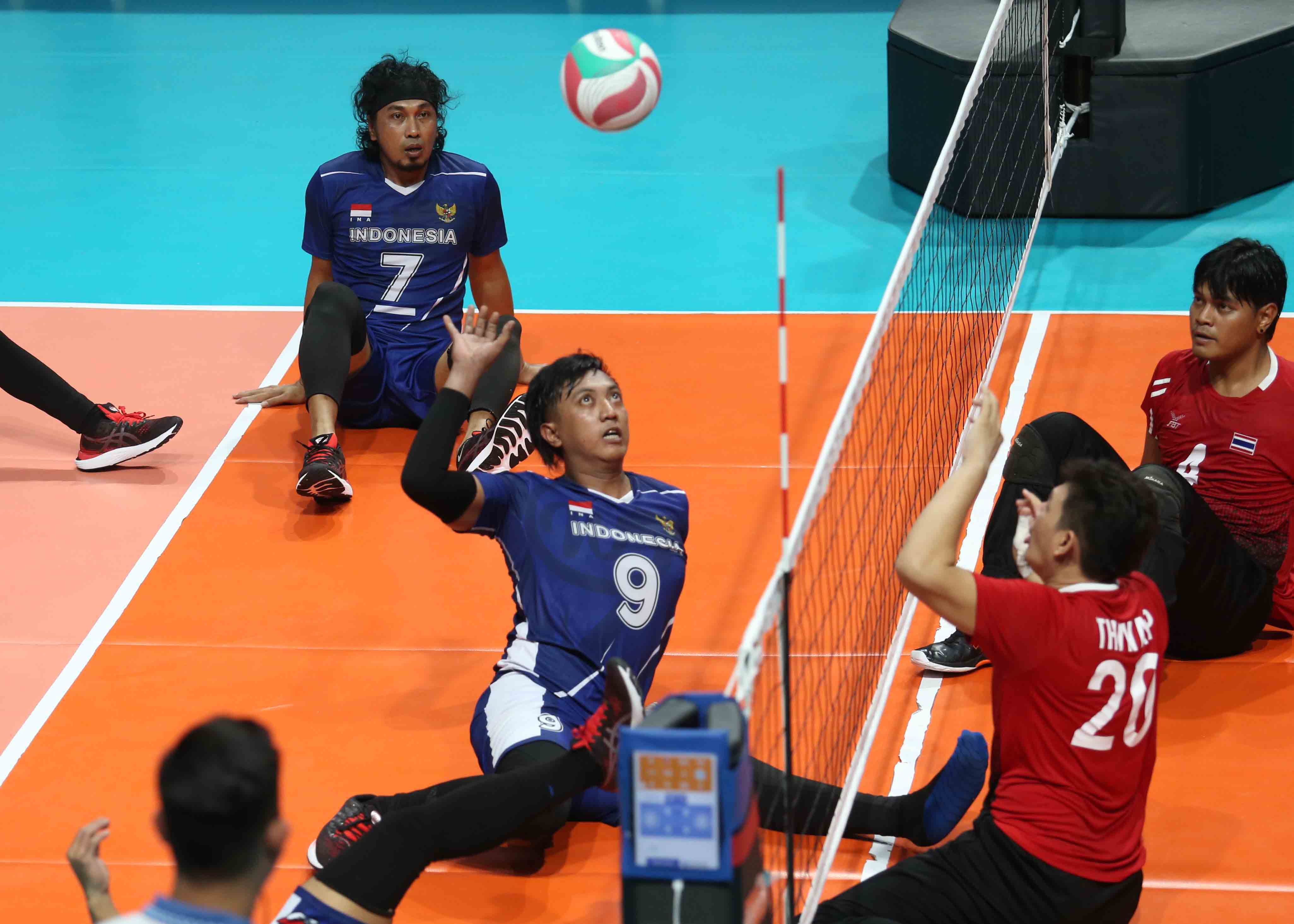 Pebola Sitting Volley Indonesia Nesa Kristiana [9] dalam aksinya saat melawan Thailand. Tim Sitting Volley Ball Indonesia (Jersey biru) harus mengakui keunggulan Thailand 1-3 pada 11th ASEAN Para Games 2022 di UTP Sport Center Solo, Jawa Tengah, Sabtu 30 Juli 2022. ( Foto : HO/INASPOC/Sportsmoment/Erly Bahtiar)