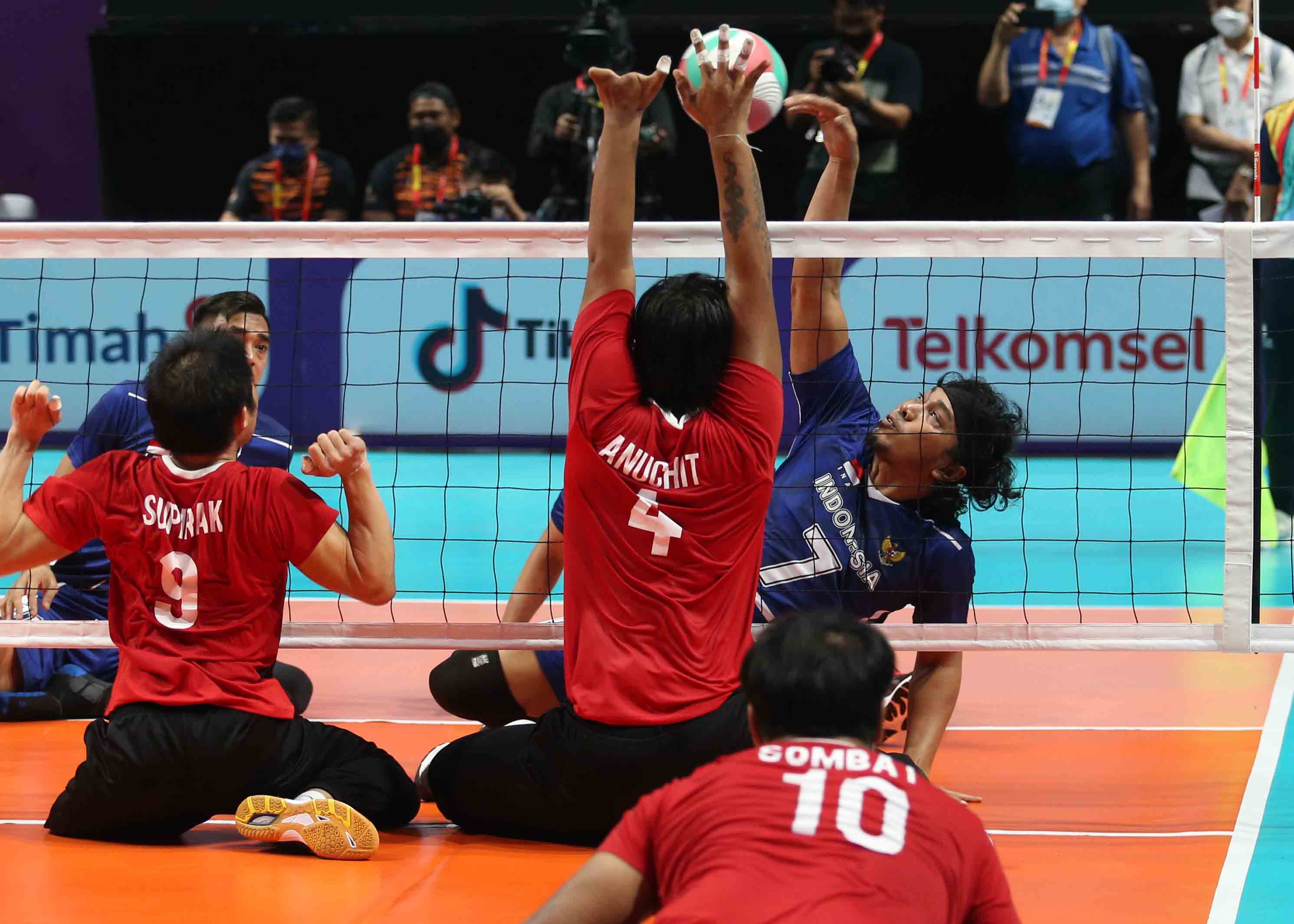 Pebola Sitting Volley Indonesia yang juga sebagai kapten tim, Nasrullah (7) melancarkan pukulan kearah lawan. Tim Sitting Volley Ball Indonesia (Jersey biru) harus mengakui keunggulan Thailand 1-3 pada 11th ASEAN Para Games 2022 di UTP Sport Center Solo, Jawa Tengah, Sabtu 30 Juli 2022. ( Foto : HO/INASPOC/Sportsmoment/Erly Bahtiar)