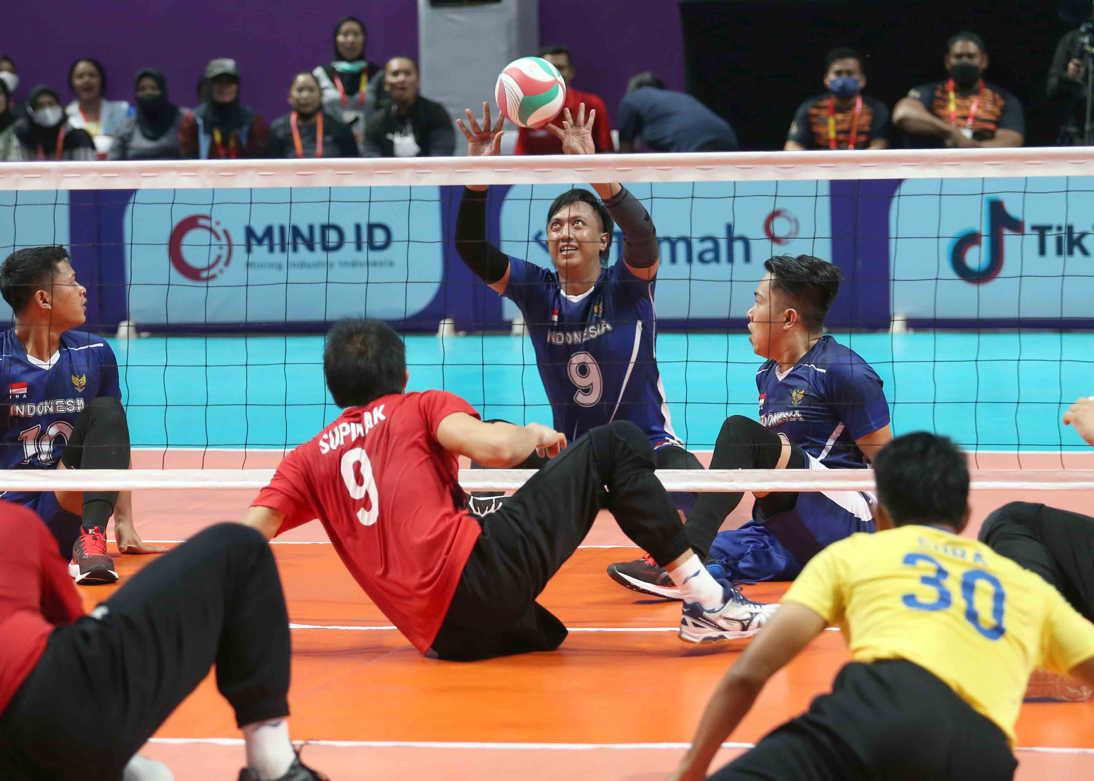 Pebola Sitting Volley Indonesia Nesa Kristiana [9] dalam aksinya saat melawan Thailand. Tim Sitting Volley Ball Indonesia (Jersey biru) harus mengakui keunggulan Thailand 1-3 pada 11th ASEAN Para Games 2022 di UTP Sport Center Solo, Jawa Tengah, Sabtu 30 Juli 2022. ( Foto : HO/INASPOC/Sportsmoment/Erly Bahtiar)
