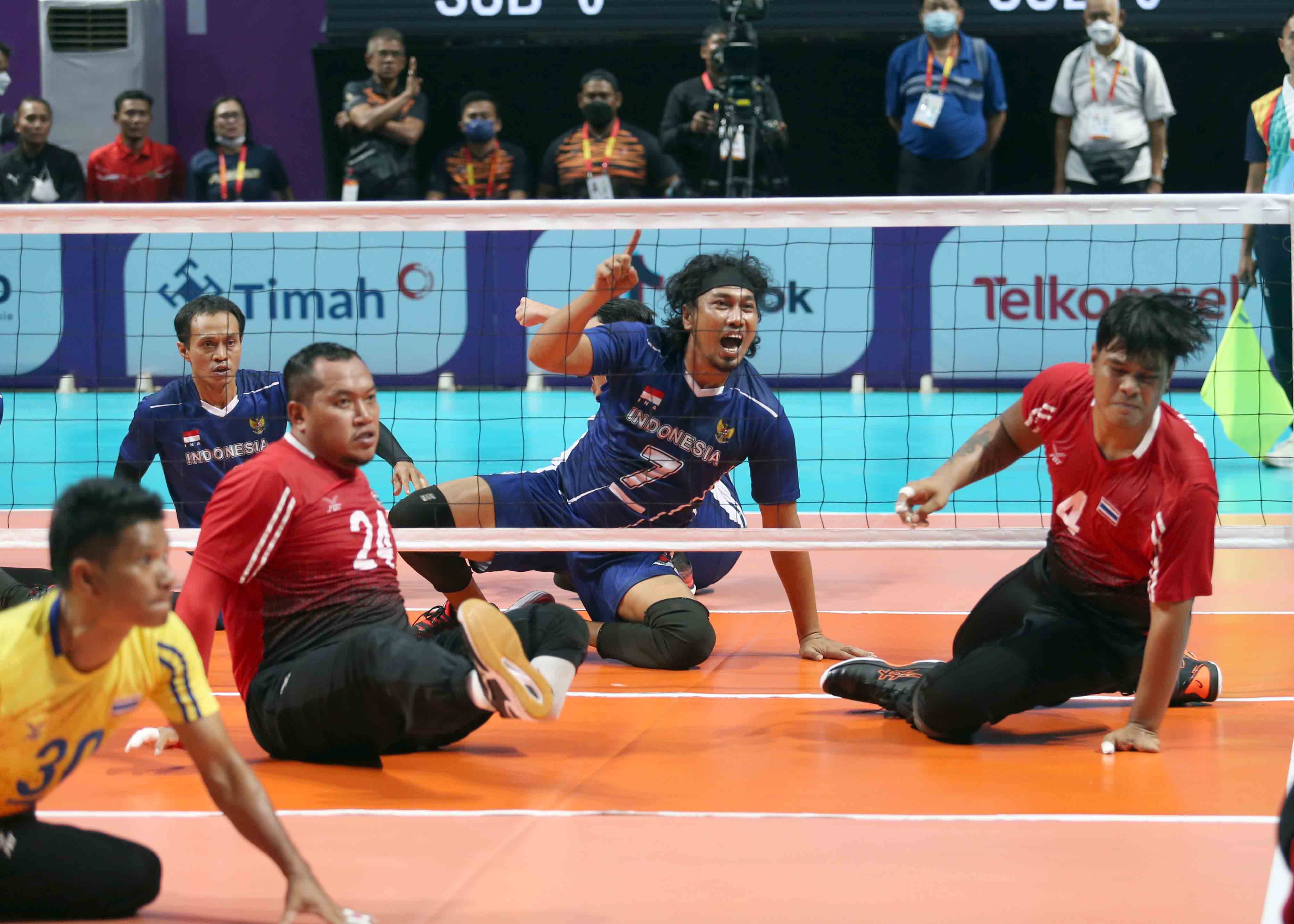 Pebola Sitting Volley Indonesia yang juga sebagai kapten tim, Nasrullah (7) meluapkan emosi setelah berhasil menambah angka bagi timnya. Tim Sitting Volley Ball Indonesia (Jersey biru) harus mengakui keunggulan Thailand 1-3 pada 11th ASEAN Para Games 2022 di UTP Sport Center Solo, Jawa Tengah, Sabtu 30 Juli 2022. ( Foto : HO/INASPOC/Sportsmoment/Erly Bahtiar)
