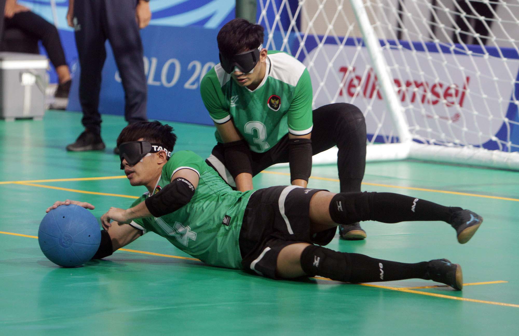 Pemain Bola Gawang Putra Indonesia, Nurhendi (depan) mencoba menangkap bola serangan tim Kamboja dalam cabang Goalball Putri 11th Asean Paragames 2022 pertandingan kedua di GOR UNS Solo (31/7/2022), Indonesia memenangkan pertandingan atas tim Kmaboja dengan skor 14 - 4. ( Foto : HO/INASPOC/Sportsmoment/Husni Yamin)