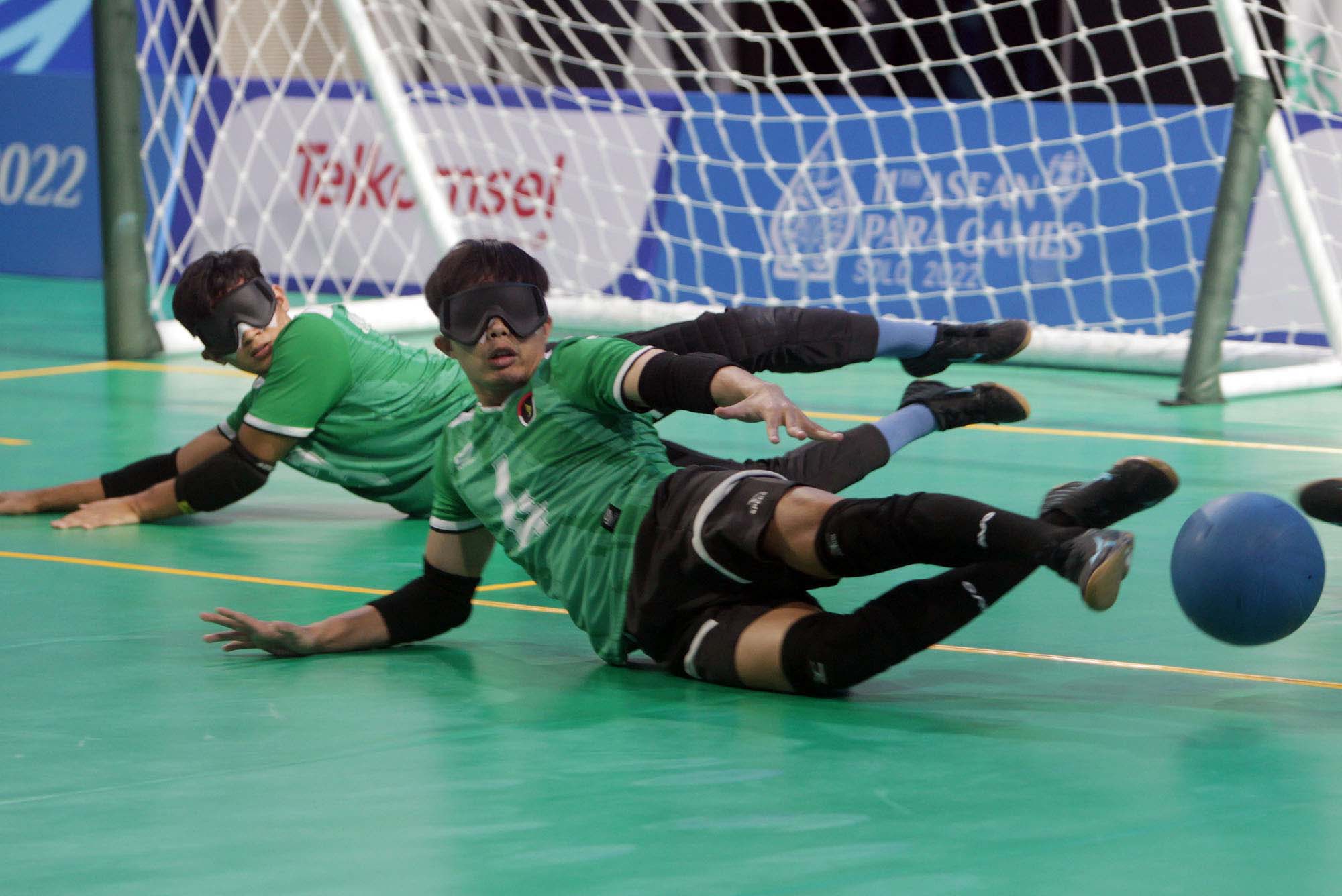 Pemain Bola Gawang Putra Indonesia, Nurfendi (depan) mencoba menghalau bola serangan tim Kamboja dalam cabang Goalball Putri 11th Asean Paragames 2022 pertandingan kedua di GOR UNS Solo (31/7/2022), Indonesia memenangkan pertandingan atas tim Kmaboja dengan skor 14 - 4 ( Foto : HO/INASPOC/Sportsmoment/Husni Yamin)