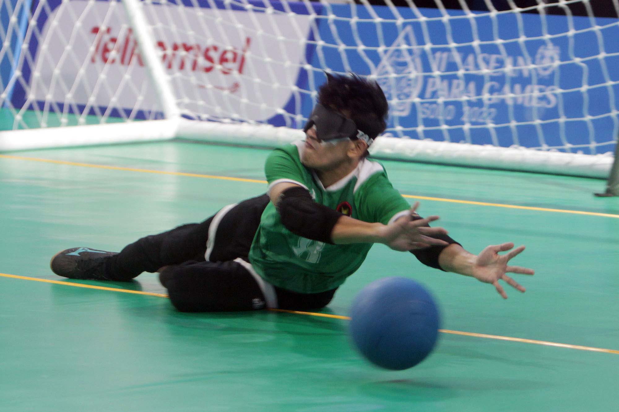 Pemain Bola Gawang Putra Indonesia, Nurfendi mencoba menangkap bola serangan tim Kamboja dalam cabang Goalball Putri 11th Asean Paragames 2022 pertandingan kedua di GOR UNS Solo (31/7/2022), Indonesia memenangkan pertandingan atas tim Kmaboja dengan skor 14 - 4. ( Foto : HO/INASPOC/Sportsmoment/Husni Yamin)