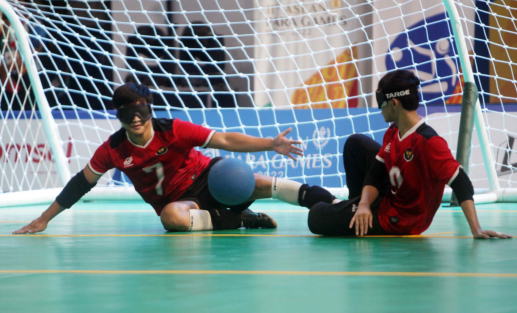 Pemain Bola Gawang Putra Indonesia, Satrio Arif Usman (kiri) bersiap menangkap bola ke gawang Laos dalam cabang Goalball Putra Asean Paragames 2022 di GOR UNS Solo (31/7/2022), Indonesia memenangkan pertandingan atas tim Laos dengan skor 13-4. ( Foto : HO/INASPOC/Sportsmoment/Husni Yamin)