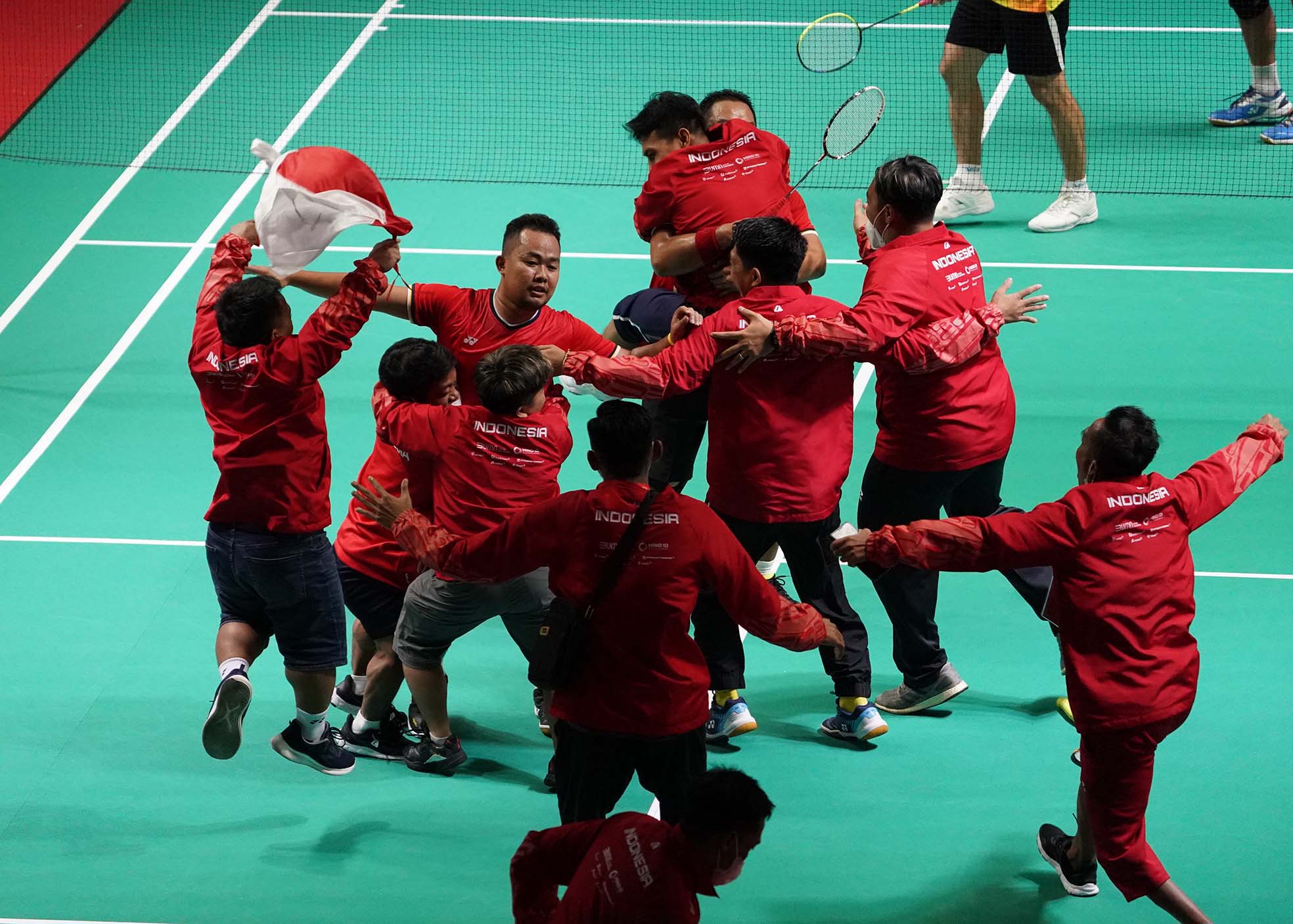 Tim bulutangkis beregu putra Indonesia meluapkan kegembiraannya seteleh memastikan Indonesia meraih medali Emas pada 11th ASEAN Para Games 2022 di UTP Sport Center Solo, Jawa Tengah, Sabtu 30 Juli 2022. Foto : HO/INASPOC/Sportsmoment/Erly Bahtiar