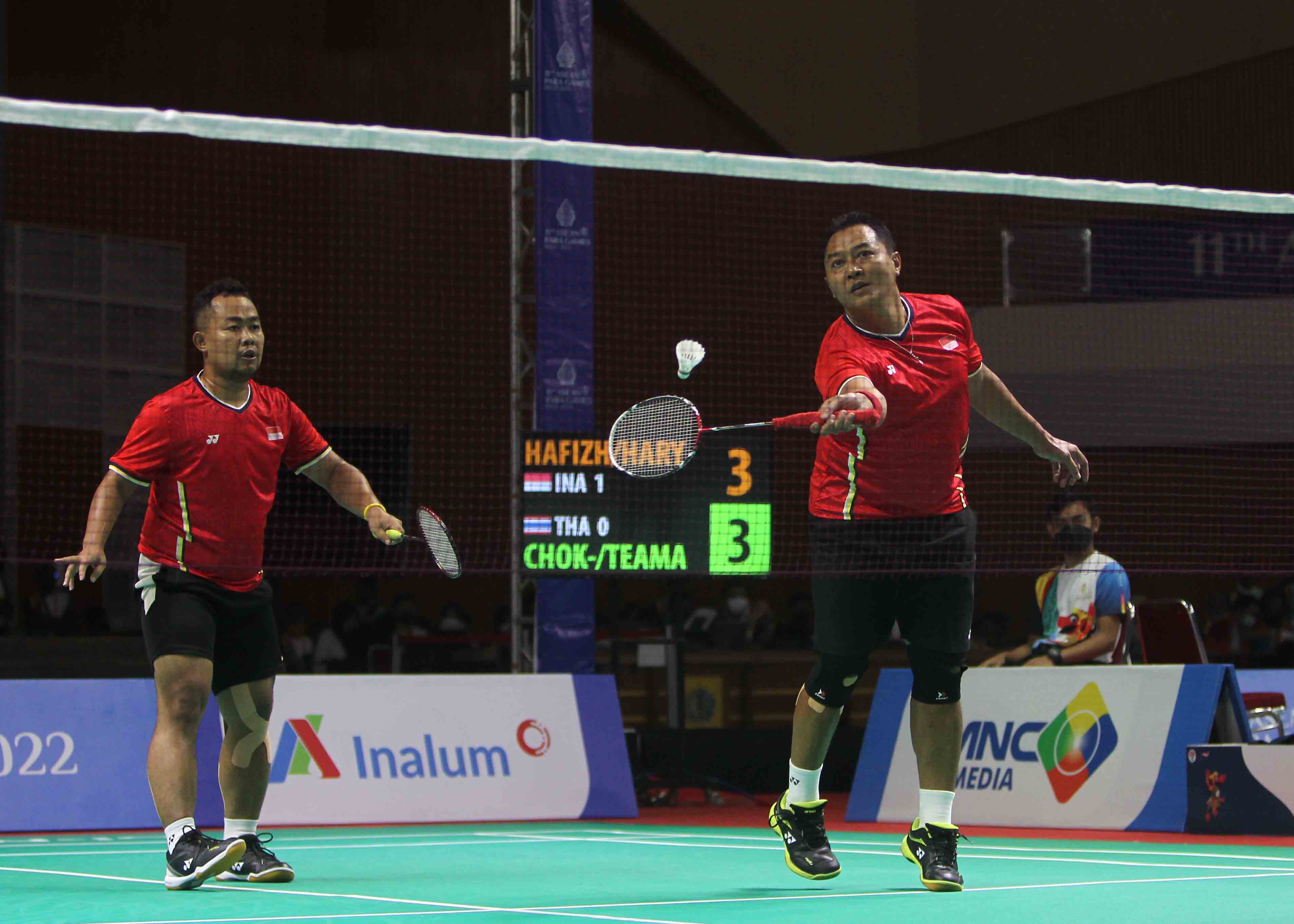Hafizh Brilliansyah Prawiranegara (Su5) dan Hary Susanto (S14) ganda putra Indonesia dalam aksinya saat Indonesia meraih medali Emas pada 11th ASEAN Para Games 2022 di UTP Sport Center Solo, Jawa Tengah, Sabtu 30 Juli 2022. Foto : HO/INASPOC/Sportsmoment/Erly Bahtiar