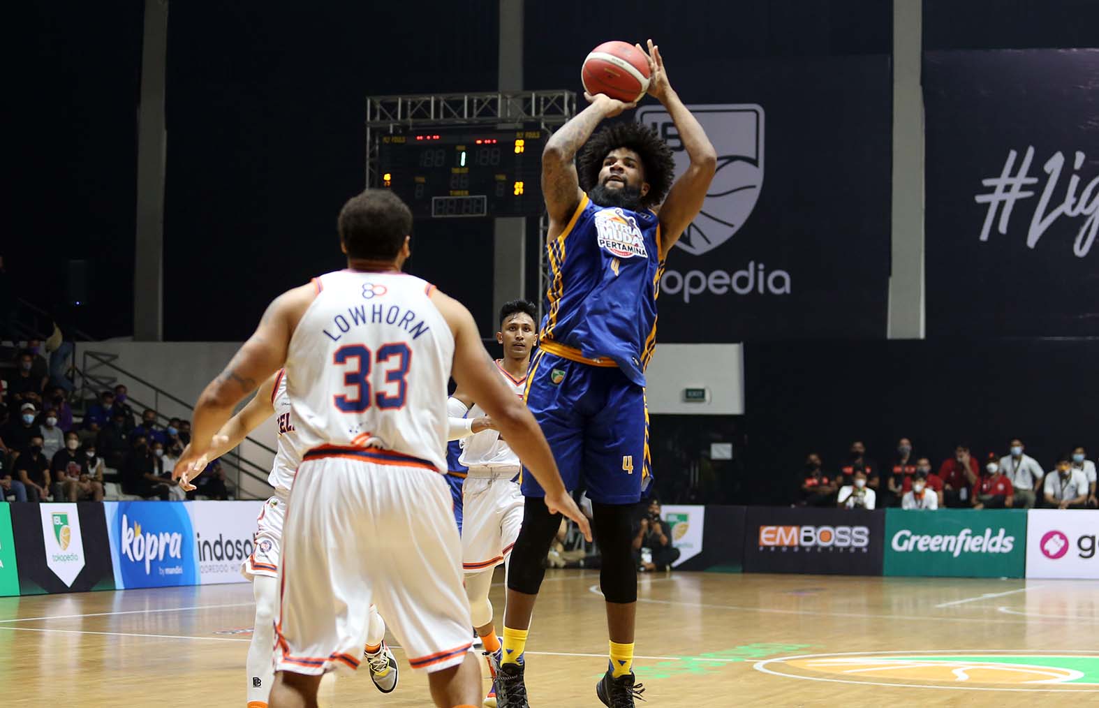 Pelita Jaya Bakrie Jakarta sukses melakukan revans terhadap Satria Muda Pertamina Jakarta atas kekalahan mereka di Final IBL 2021. Pada hari pertama IBL 2022 Sabtu (15/1/2022), Pelita Jaya menang 69-65 di Hall Basket Gelora Bung Karno (GBK), Senayan, Jakarta. (Foto : Erly Bahtiar/Sportsmoment.id)