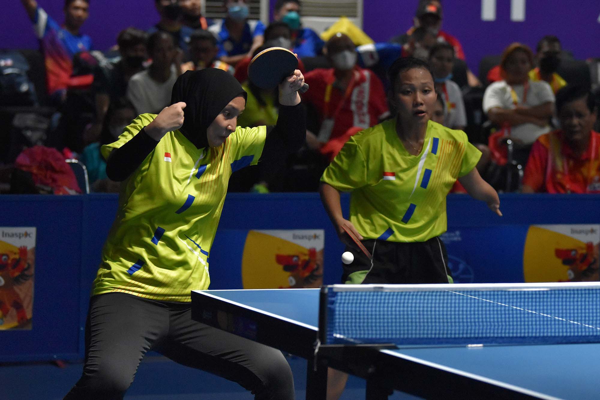 Aksi salah satu kontingen ganda putri Indonesia dalam ajang kejuaraan tenis meja Asean Para Game di Solo Techno Park 31 Juli 2022. Foto : HO/INASPOC/Sportsmoment/Wibowo Rahardjo