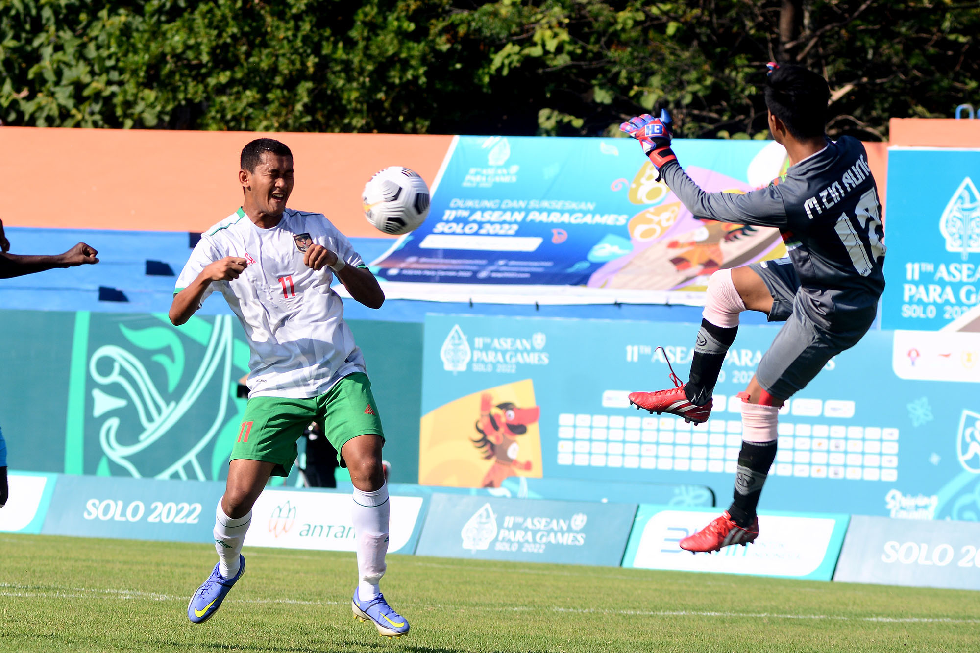Pemain Timnas Indonesia Muh Ikhsan Tabrani (kiri) berusaha membobol gawang Myanmar saat babak penyisihan, CP Football ASEAN Paragames 2022 di Stadion UNS, Senin (1/8). Indonesia menang 5-1 atas Myanmar. Foto : HO/INASPOC/Sportsmoment/Yoma Times Suryadi