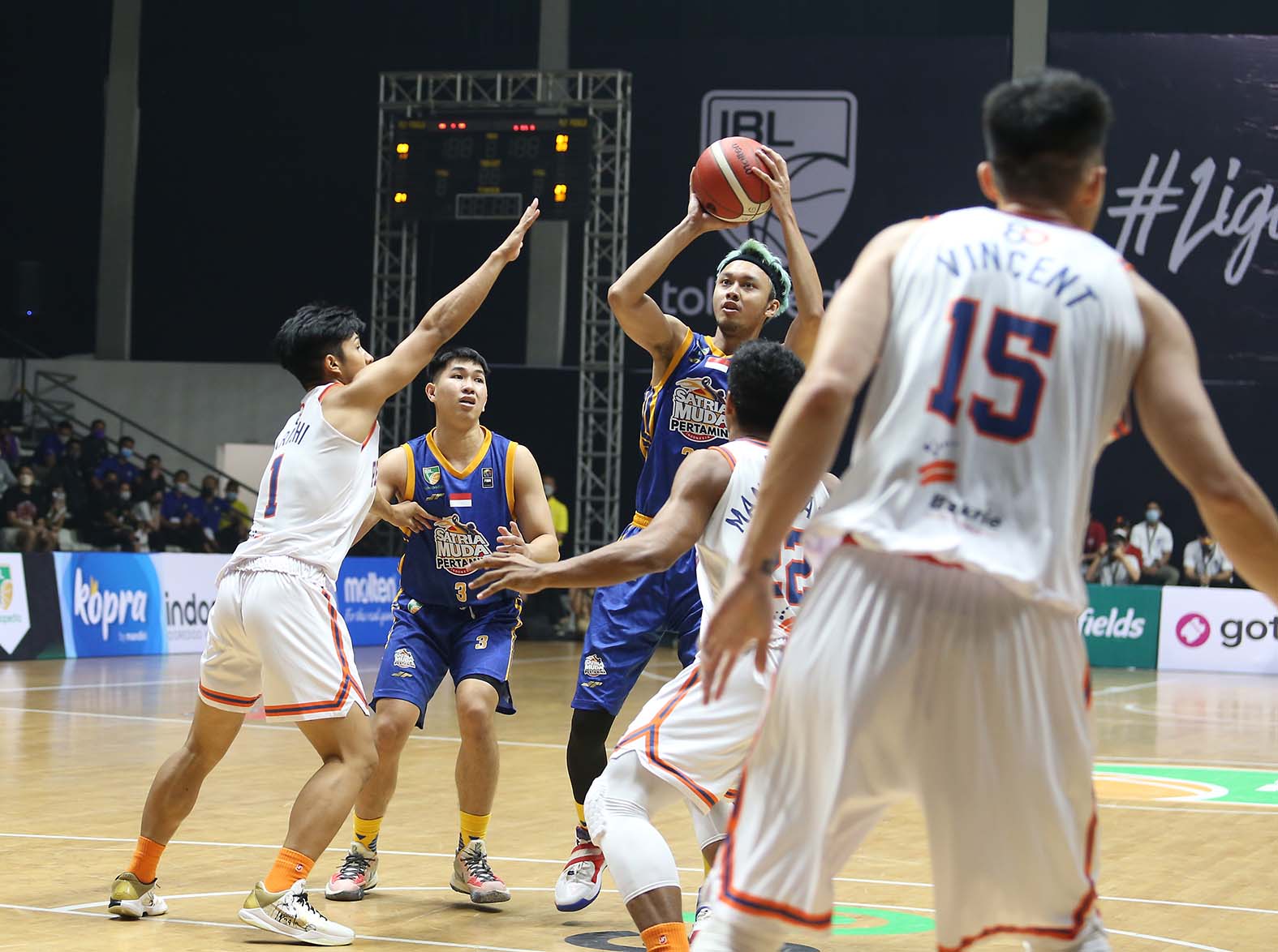 Pelita Jaya Bakrie Jakarta sukses melakukan revans terhadap Satria Muda Pertamina Jakarta atas kekalahan mereka di Final IBL 2021. Pada hari pertama IBL 2022 Sabtu (15/1/2022), Pelita Jaya menang 69-65 di Hall Basket Gelora Bung Karno (GBK), Senayan, Jakarta. (Foto : Erly Bahtiar/Sportsmoment.id)