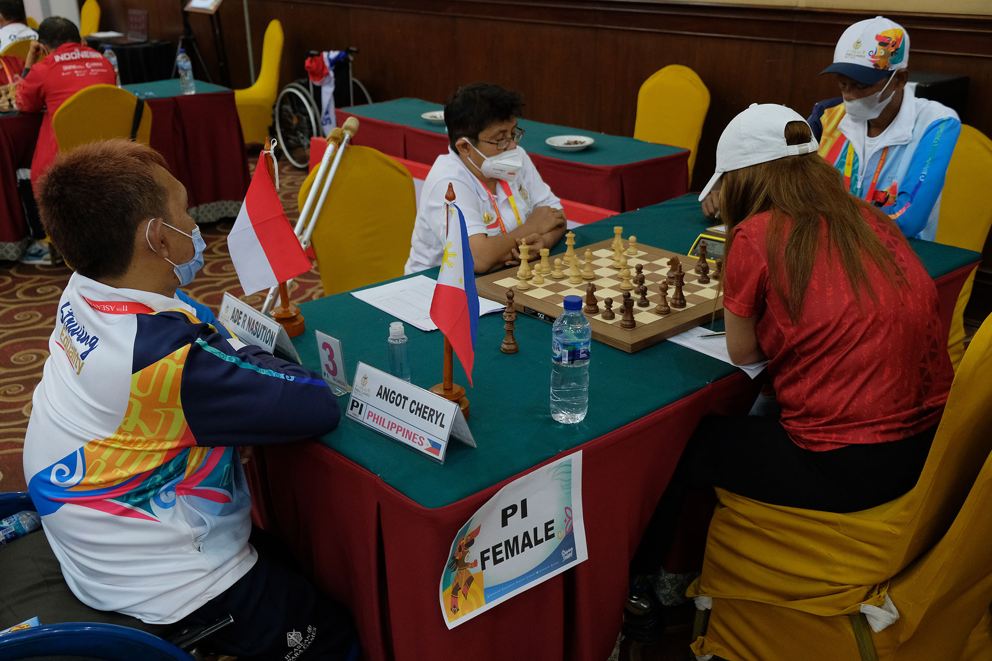Pecatur putri senior Indonesia Ade R. Nasution (kiri) berhasil mengalahkan Cheryl Angot asal Philipina, kategori individu standar PI babak ke 4 Para Chess , 11th ASEAN Para Games 2022 yang berlangsung di LOrin Hotel Solo 01 Agustus 2022. Foto : HO/INASPOC/Sportsmoment/Sofyan Adi