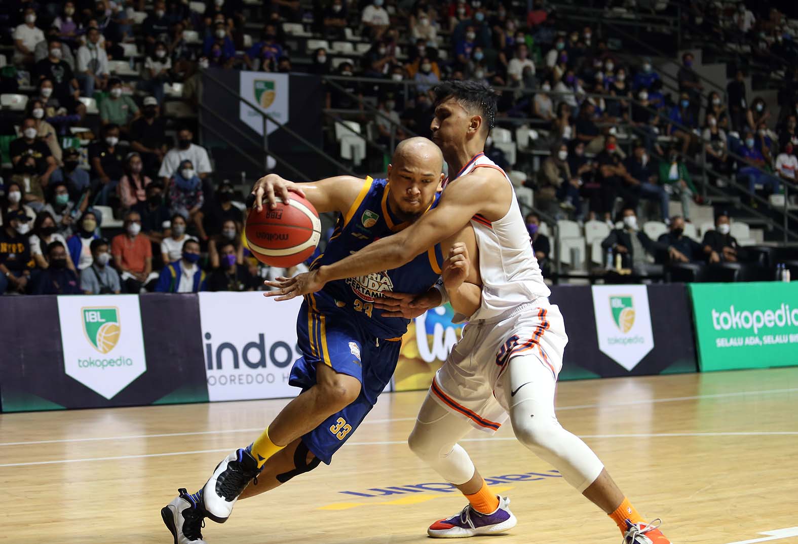 Pelita Jaya Bakrie Jakarta sukses melakukan revans terhadap Satria Muda Pertamina Jakarta atas kekalahan mereka di Final IBL 2021. Pada hari pertama IBL 2022 Sabtu (15/1/2022), Pelita Jaya menang 69-65 di Hall Basket Gelora Bung Karno (GBK), Senayan, Jakarta. (Foto : Erly Bahtiar/Sportsmoment.id)