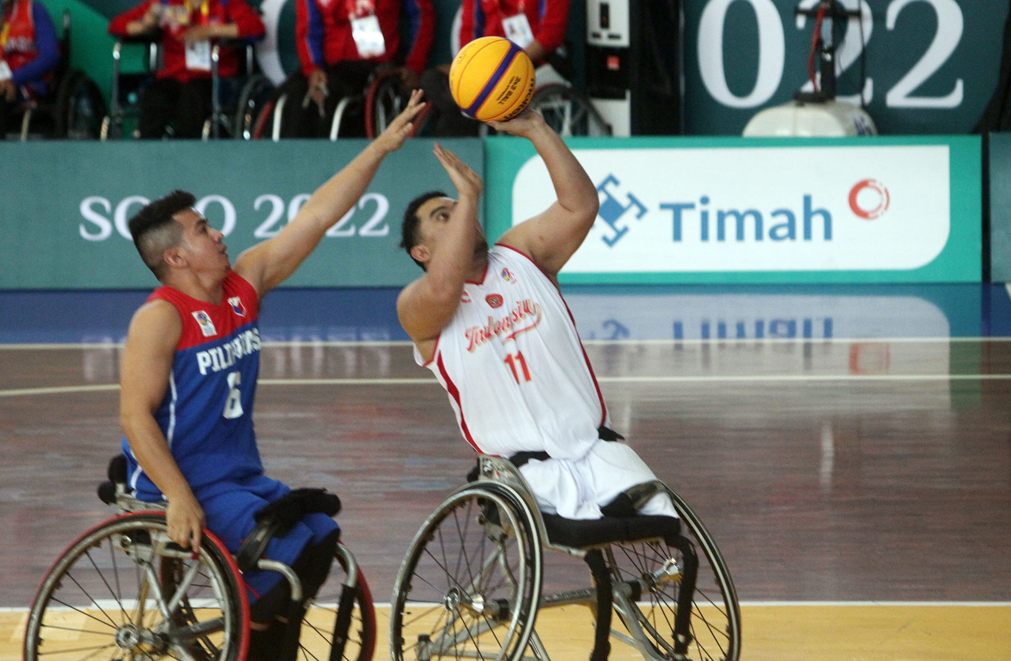 Pebasket kursi roda dari Indonesia Kasep Ayatulloh MA (kanan) berusaha melempar bola keranjang, dalam cabang Wheelchair Basketball Asean Paragames, yang berlangsung di GOR Sritex Arena (30/7/2022). Indonesia kalah atas Philipina dengan skor 10 - 15. Foto : HO/INASPOC/Sportsmoment/Husni Yamin