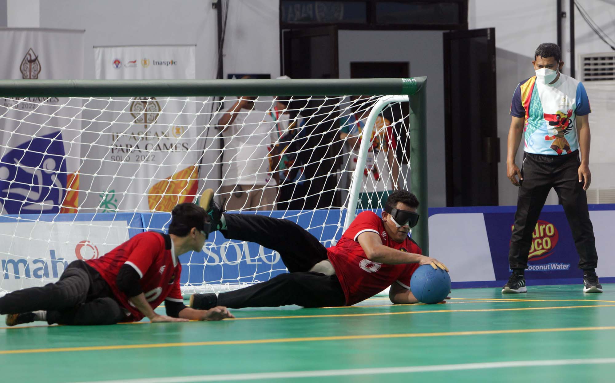 Pemain Bola Gawang Puta Indonesia, Arif Setiawan (kanan) dan Andi Santoso (kiri) menangkap bola lemparan pemain Thailand dalam cabor Goalball Putra 11th ASEAN Para Games 2022 di GOR UNS Solo (1/8/2022). Indonesia harus mengakui keunggulan Thailand dengan skor 1-11. Foto : HO/INASPOC/Sportsmoment/Husni Yamin