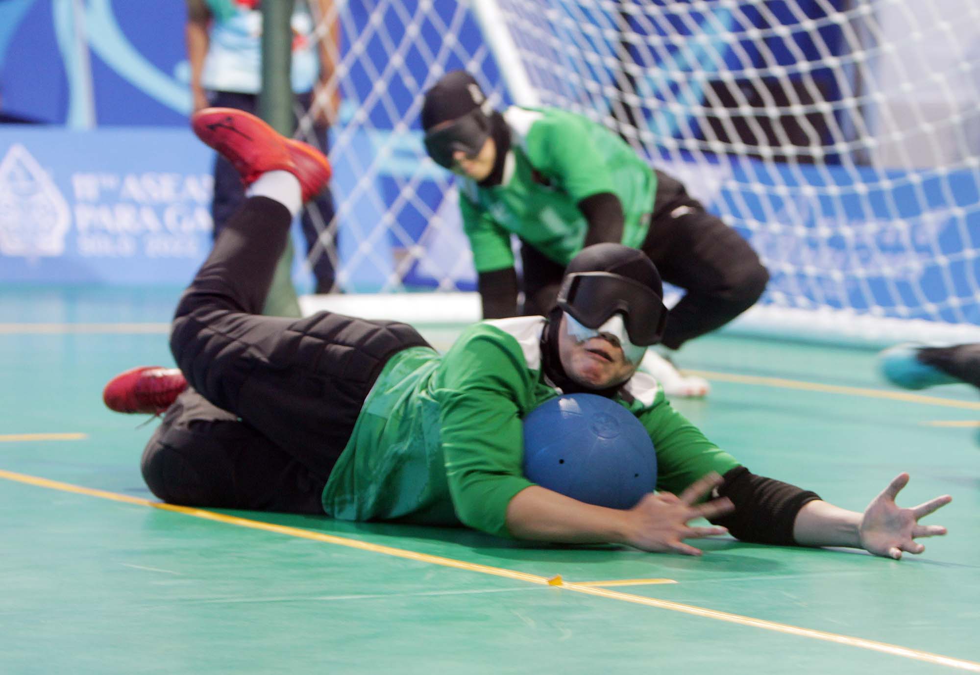 Pemain Bola Gawang Putri Indonesia Fitri Mulya Sari berhasil menangkap bola lemparan dari pemain Thailand, dalam cabor Goalball 11th Asean Para Games 2022 yang berlangsung di GOR UNS Solo (1/8/2022). Foto : HO/INASPOC/Sportsmoment/Husni Yamin