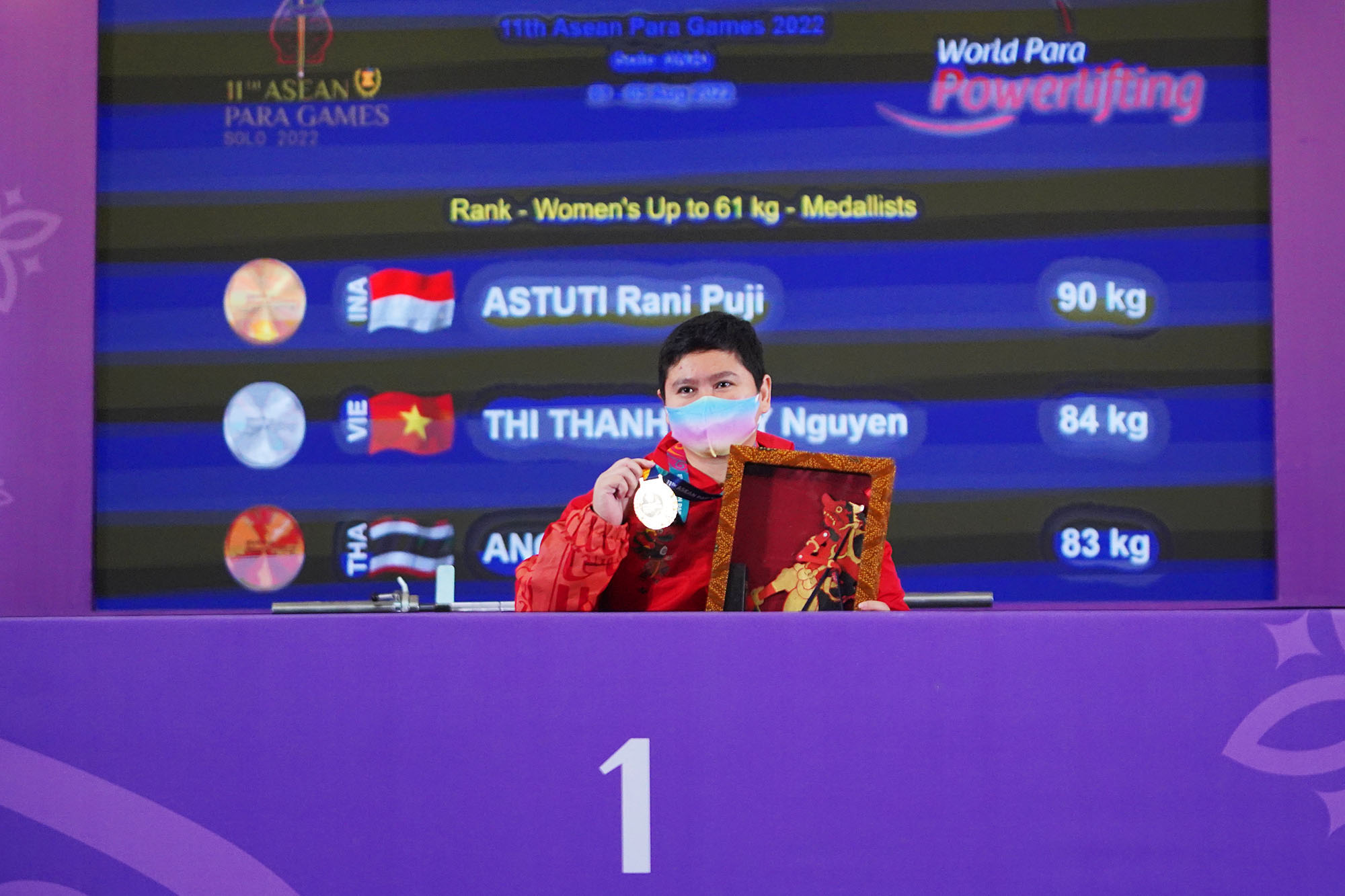 Rani Puji Astuti akhirnya mendapatkan emas pertamanya di 11 th ASEAN Para Games di Hotel Paragon Solo, (1/08/2022).Prestasi tersebut mengangiri penantian Rani meraih medali emas di APG. Pada dua edisi APG sebelumnya di Myanmar (2015) dan Malaysia (2017) mentok di medali perak.Foto : HO/INASPOC/Sportsmoment/Tandur Rimoro