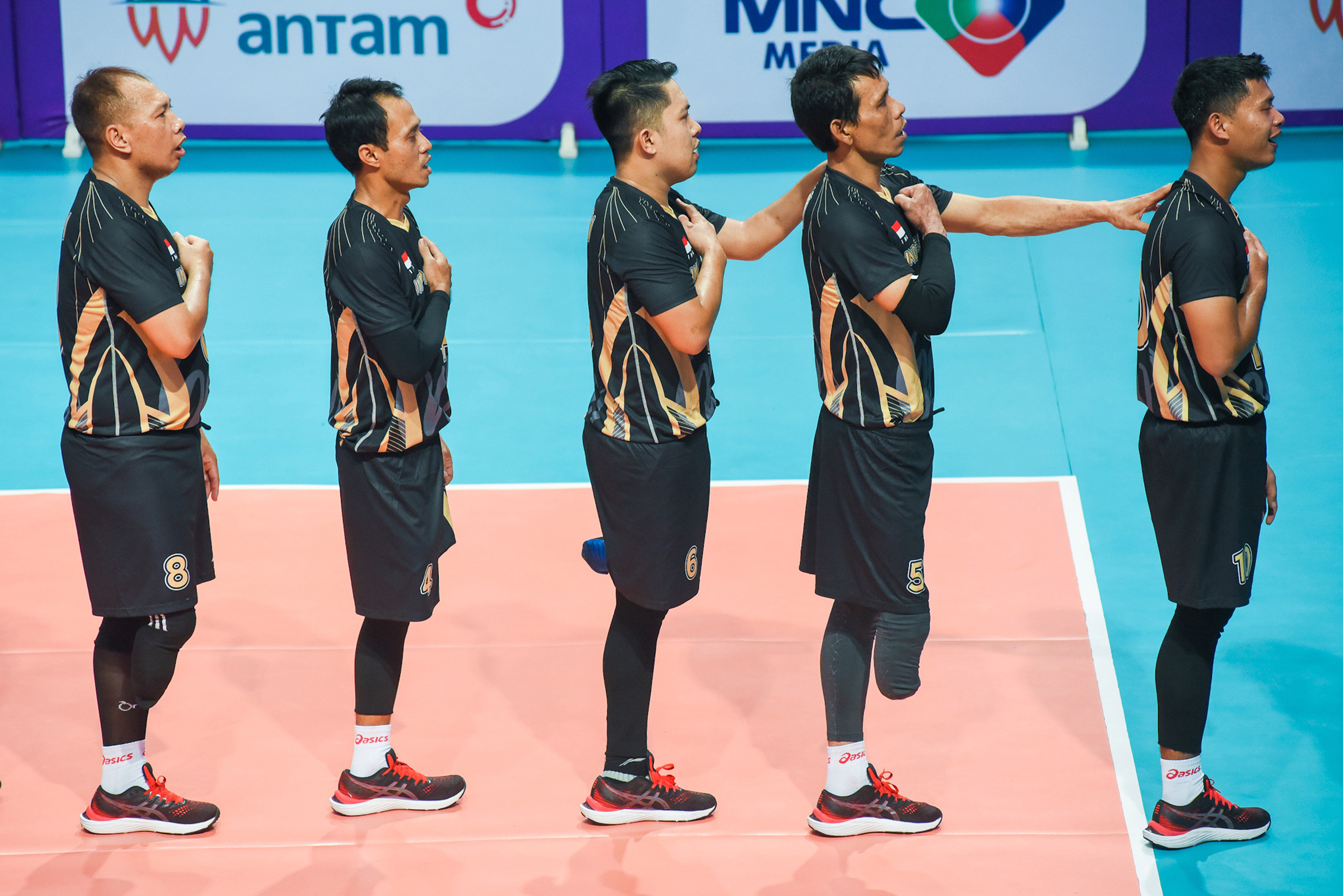 Atlet bola voli duduk putra Indonesia menyanyikan lagu Indonesia Raya saat akan bertanding melawan tim bola voli duduk Malaysia pada babak penyisihan ASEAN Paragames 2022 di GOR UTP Karanganyar, Jawa Tengah, Senin (1/8/2022). Foto : HO/INASPOC/Sportsmoment/FERI SETIAWAN