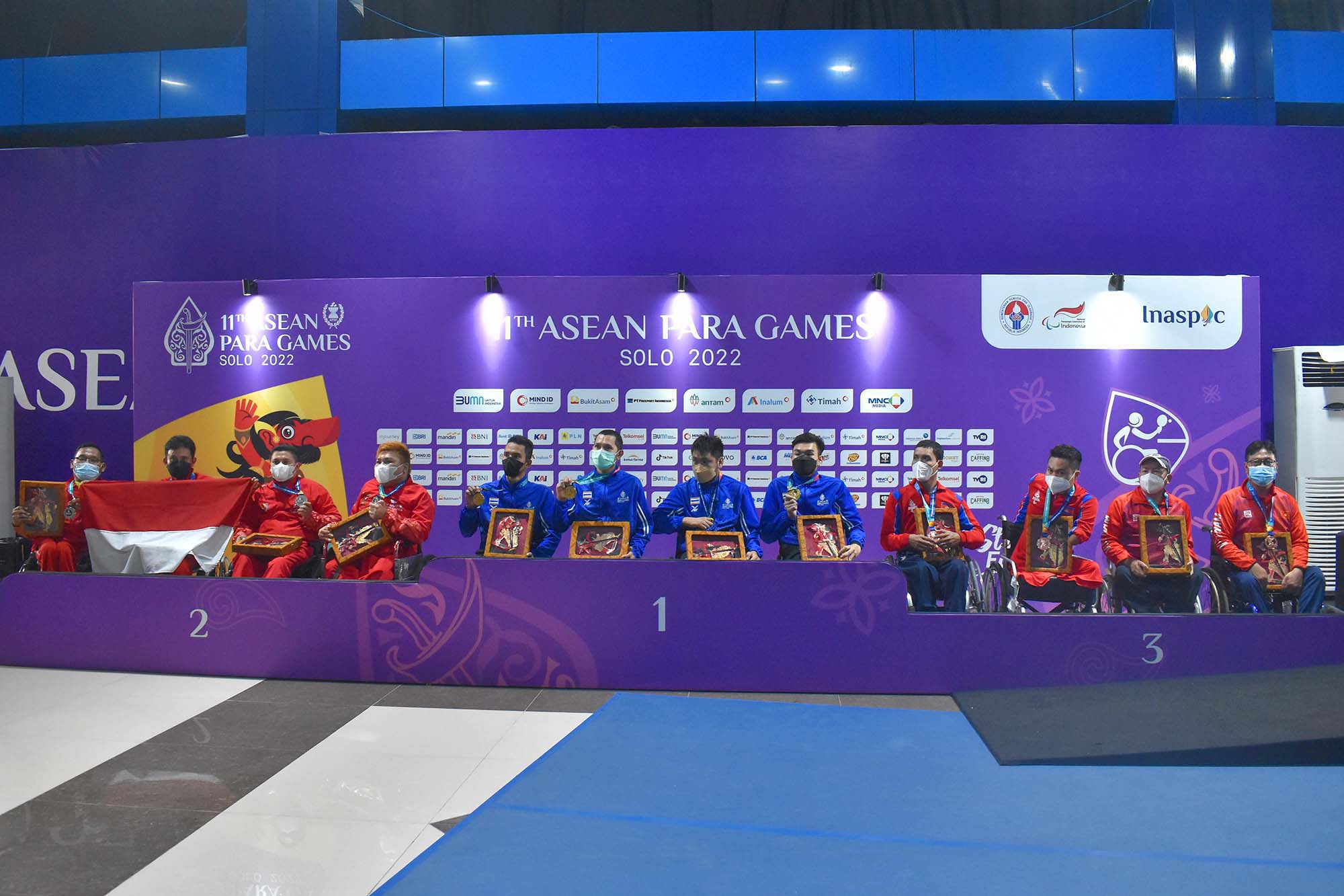 Perolehan medali perak oleh team putra dari Indonesia Audy Ngangi, Andi Santoso, Sefrianto dan Cahyo Pambudi dalam cabor tenis meja class Men Team-TT 1-3 hari ke tiga, Senin 1 Agustus 2022 11th Asean Para Games Solo 2022 di Solo Techno Park. Foto : HO/INASPOC/Sportsmoment/Wibowo Rahardjo