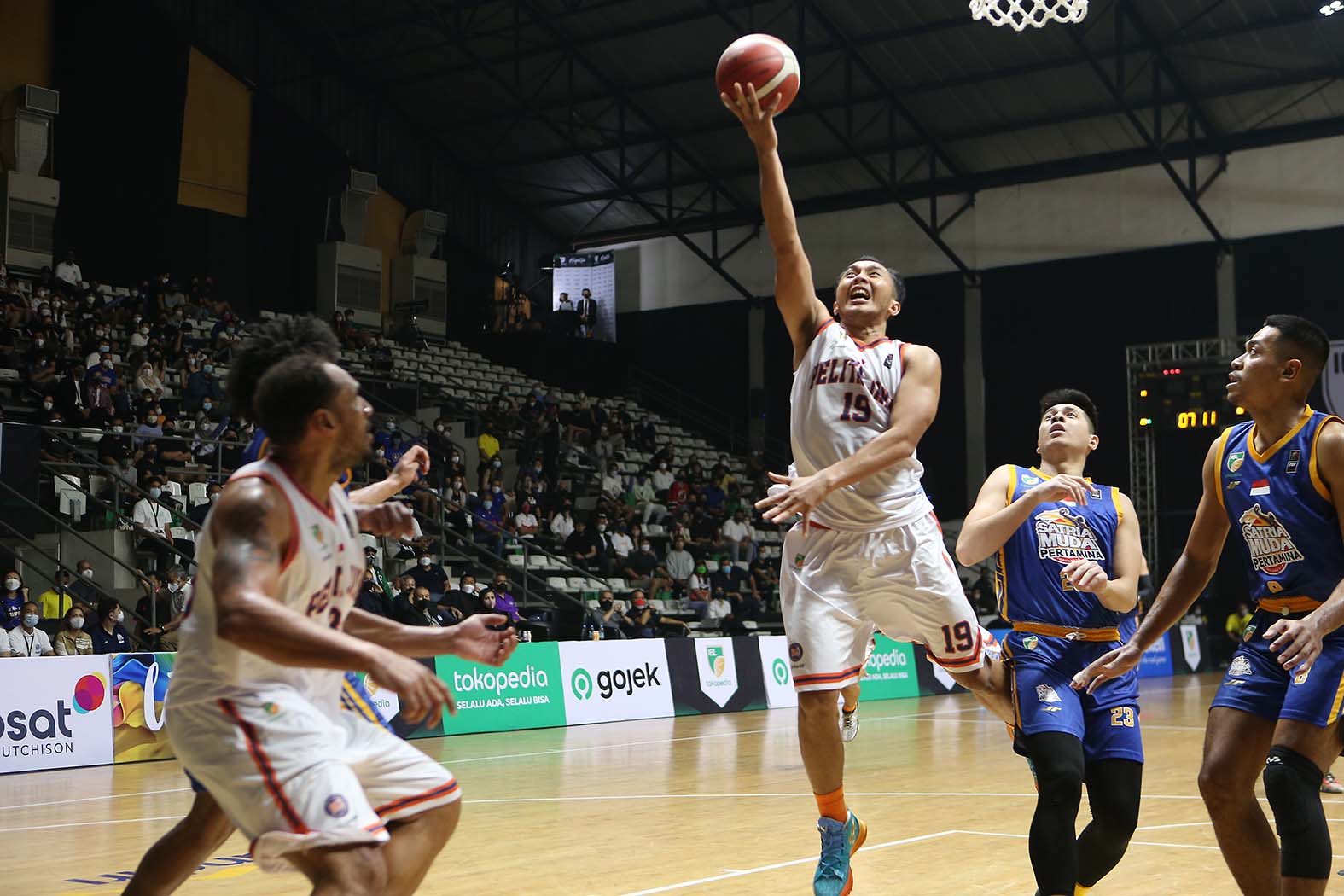 Pelita Jaya Bakrie Jakarta sukses melakukan revans terhadap Satria Muda Pertamina Jakarta atas kekalahan mereka di Final IBL 2021. Pada hari pertama IBL 2022 Sabtu (15/1/2022), Pelita Jaya menang 69-65 di Hall Basket Gelora Bung Karno (GBK), Senayan, Jakarta. (Foto : Erly Bahtiar/Sportsmoment.id)
