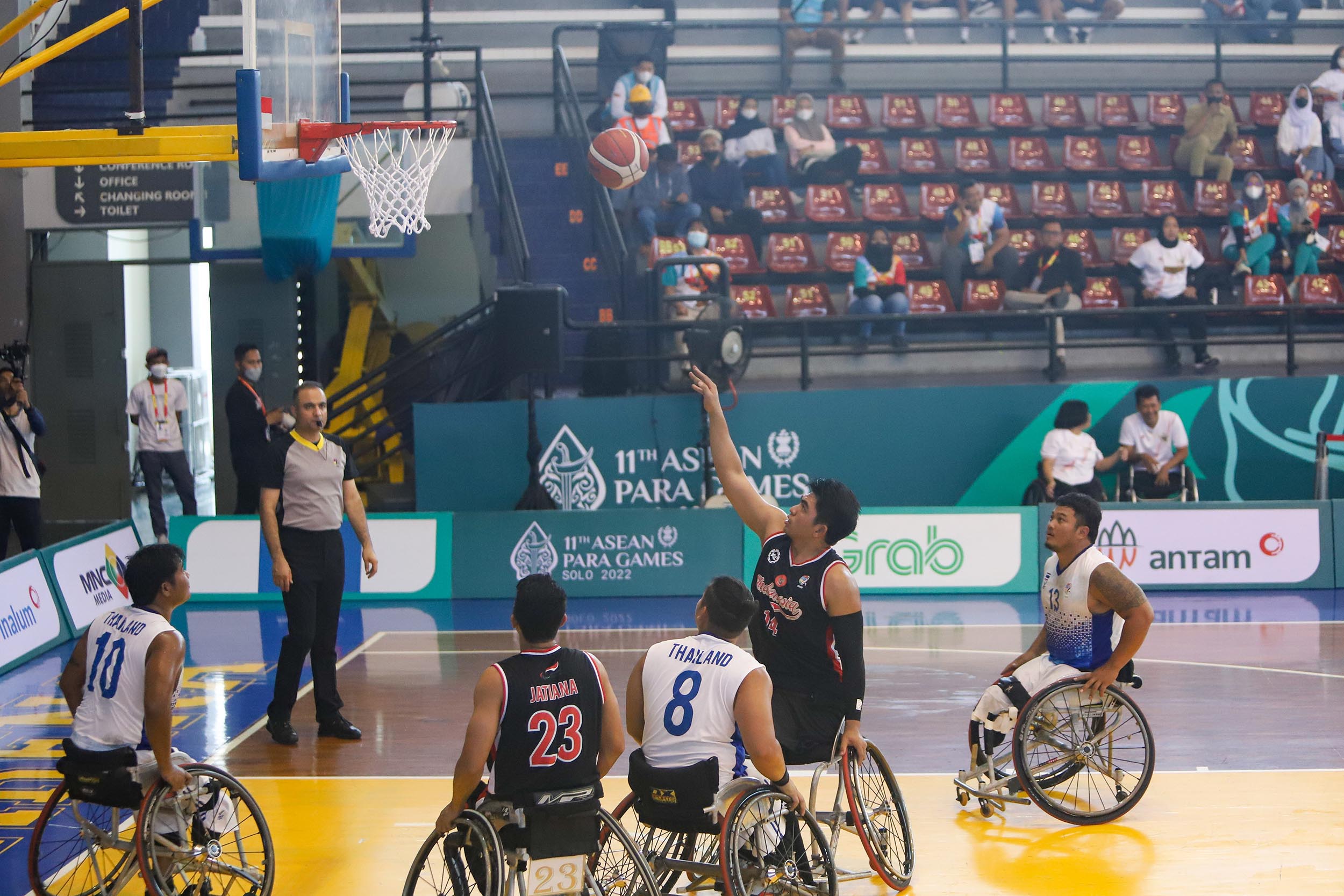 Men Wheelchair Basketball Indonesia Kalah Dari Thailand. Pemain Timnas Men Wheelchair Basketball Indonesia, I Komang Suparta melepaskan tembakan saat melawan Thailand di nomor 5x5 Men Wheelchair Basketball pada gelaran 11th ASEAN Para Games Solo 2022, di Sritex Arena, Solo, Jawa Tengah, Senin 1 Agustus 2022. Tim putra Indonesia kalah dengan skor 68-29. Foto : HO/INASPOC/Sportsmoment/Muhamad Solihin