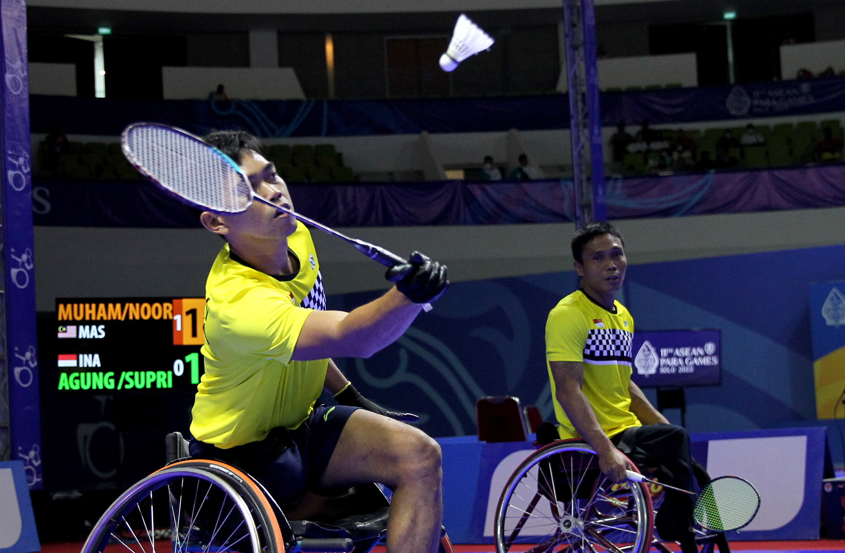 Pebulutangkis Indonesia Supriyadi (kiri) dan Agung Widodo (kanan) dalam aksinya saat pertandingan di nomer Ganda pada 11th ASEAN PARAGAMES 2022 di Auditorium Universitas Muhammadyah Surakarta, Solo, Selasa, 2/08/2022.Foto : HO/INASPOC/Sportsmoment/Ardy Alvez