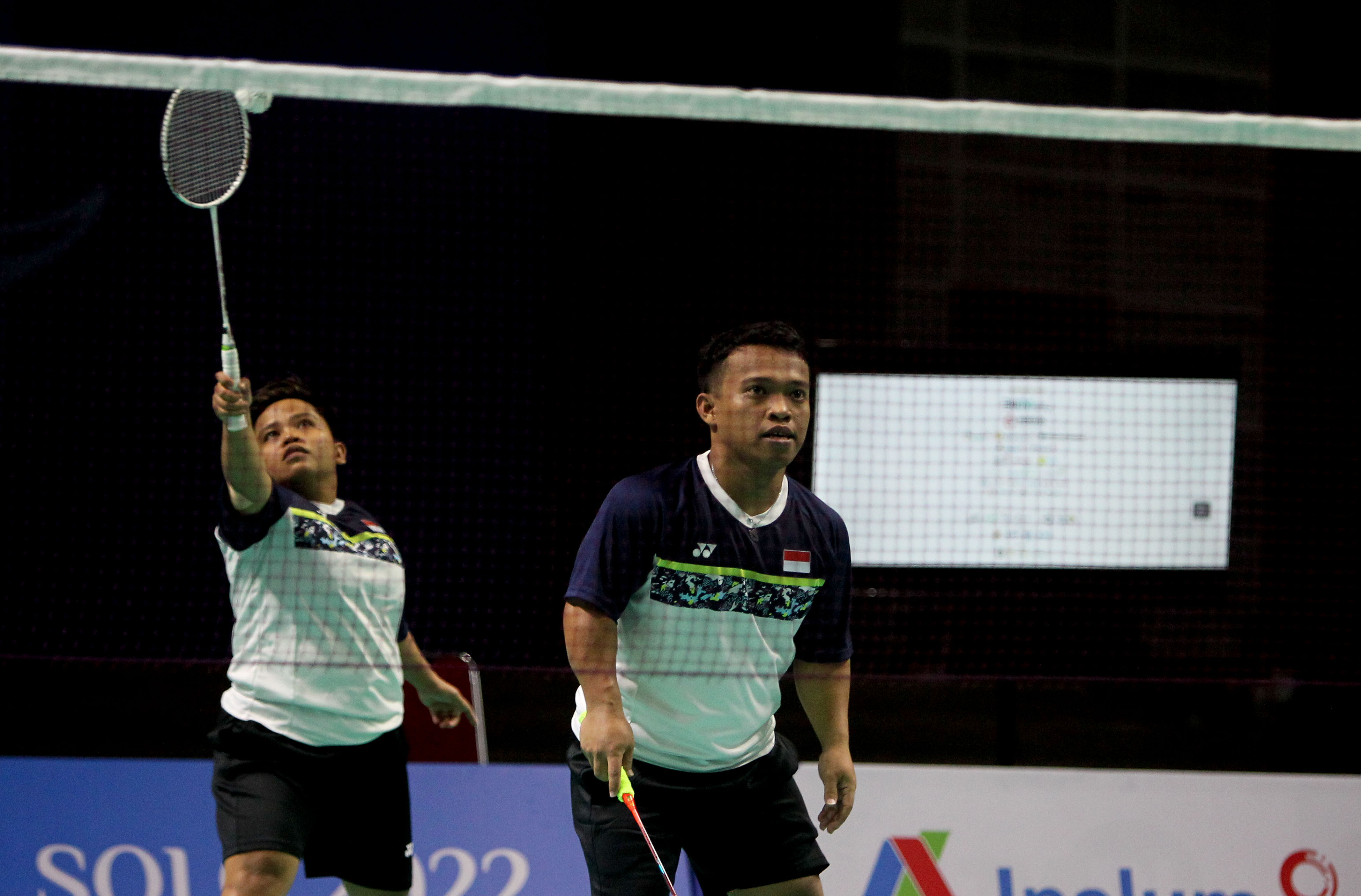 Pebulutangkis Indonesia Rina Marlina (kiri) dan Subhan (kanan) dalam aksinya saat pertandingan di nomer Ganda Campuran pada 11th ASEAN PARAGAMES 2022 di Auditorium Universitas Muhammadyah Surakarta, Solo, Selasa, 2/08/2022.Foto : HO/INASPOC/Sportsmoment/Ardy Alvez
