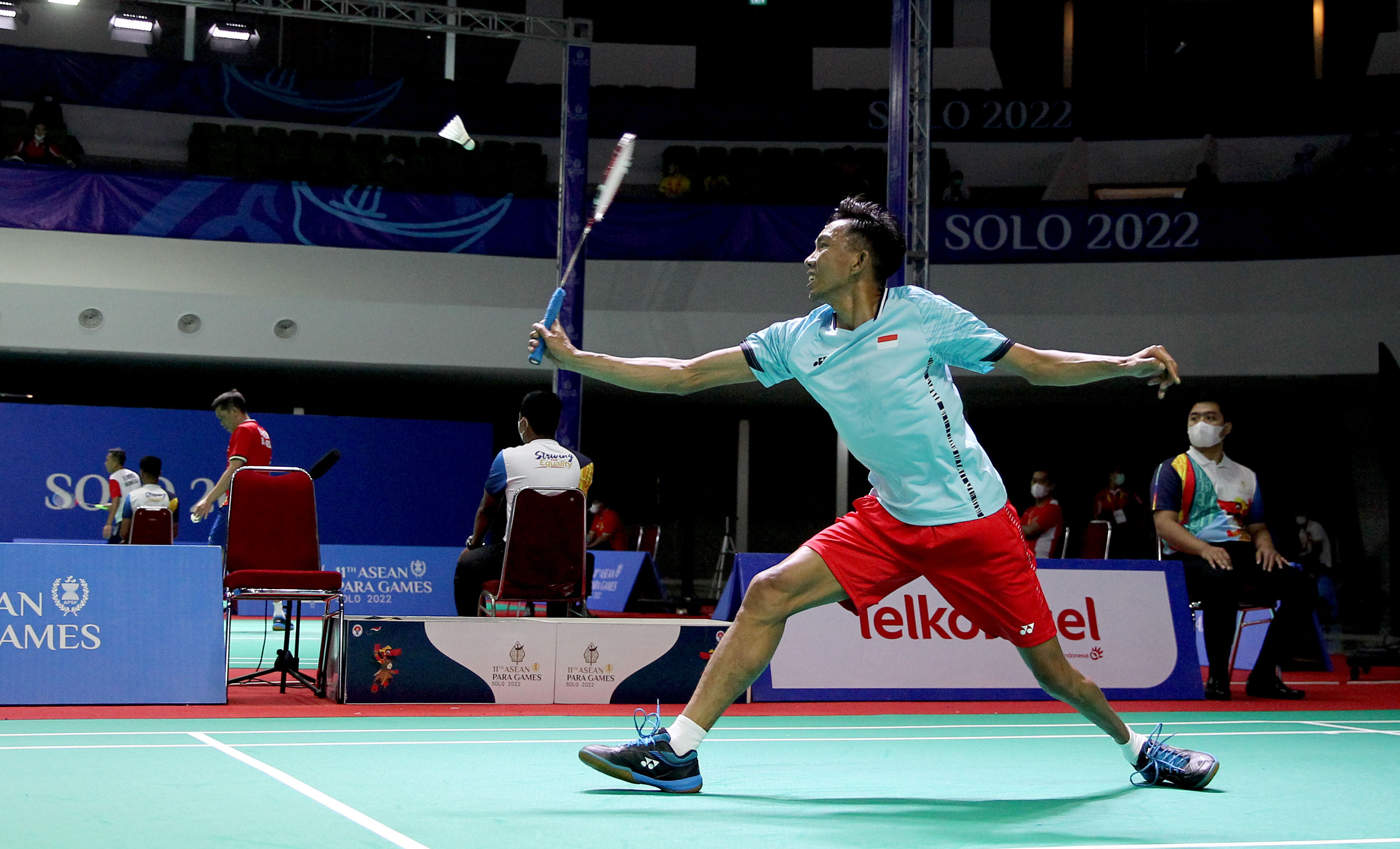Pebulutangkis Indonesia Maman Nurjaman dalam aksinya saat pertandingan di nomer Perseorangan pada 11th ASEAN PARAGAMES 2022 di Auditorium Universitas Muhammadyah Surakarta, Solo, Selasa, 2/08/2022.Foto : HO/INASPOC/Sportsmoment/Ardy Alvez