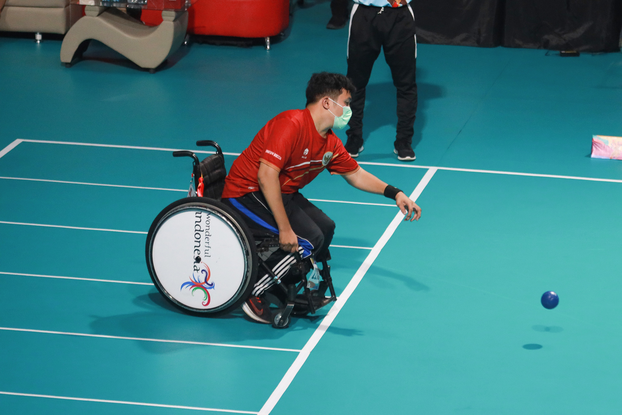 Atlet boccia Indonesia Muhammad Satria Bintang Herlangga melakukan lemparan dalam pertandingan melawan Watcharaphon Vongsa asal Thailand di nomor Men’s Individual kelas BC2 cabang olahraga boccia. kalah dengan skor akhir 2 - 8. Pertandingan ini digelar di GOR Fakultas Olahraga UNS, Surakarta. Selasa, 2 Agustus 2022.Foto : HO/INASPOC/Sportsmoment/Agustinus Tri Mulyadi
