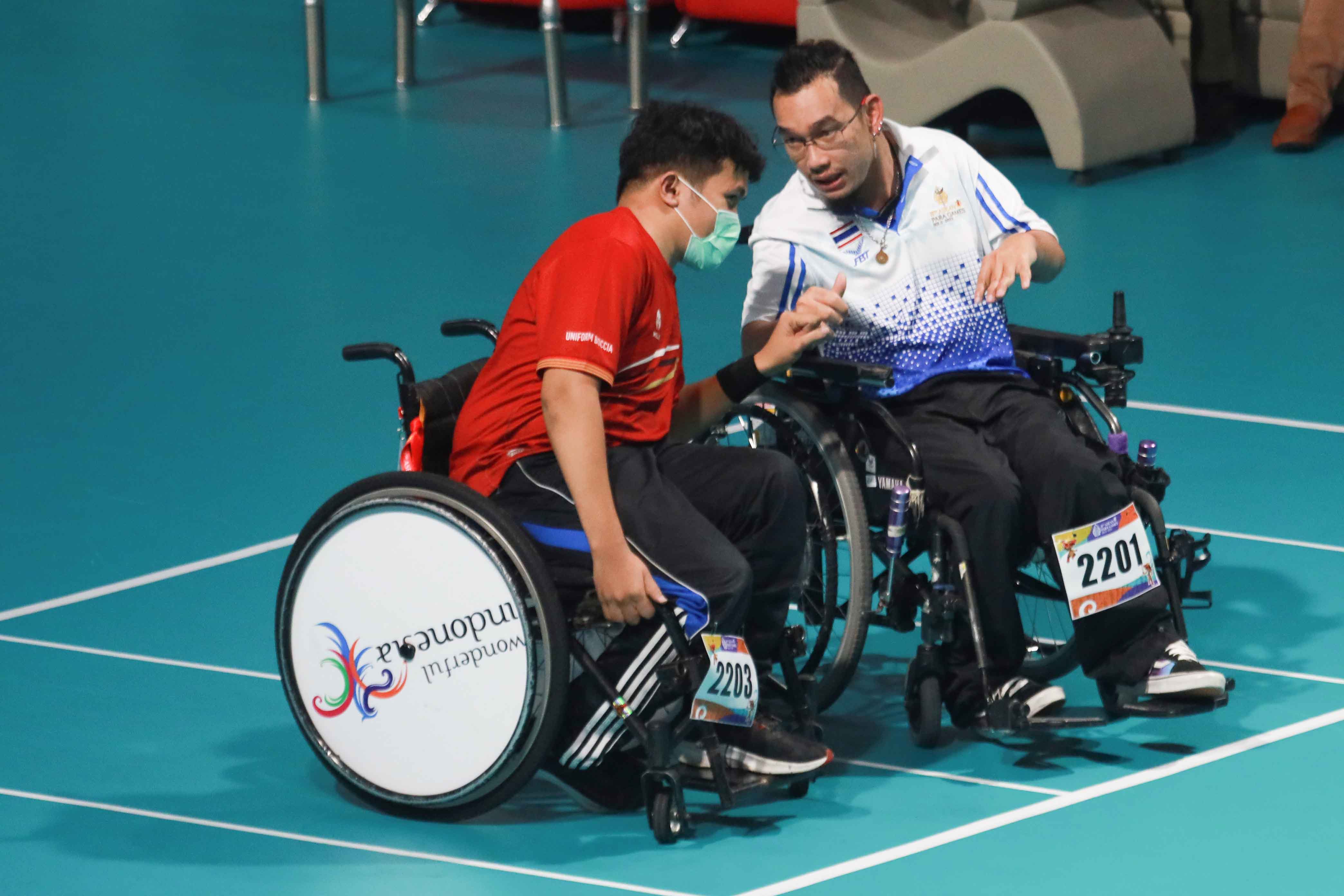 Atlet boccia Indonesia Muhammad Satria Bintang Herlangga bersalaman dalam pertandingan melawan Watcharaphon Vongsa asal Thailand di nomor Men’s Individual kelas BC2 cabang olahraga boccia. kalah dengan skor akhir 2 - 8. Pertandingan ini digelar di GOR Fakultas Olahraga UNS, Surakarta. Selasa, 2 Agustus 2022. Foto : HO/INASPOC/Sportsmoment/Agustinus Tri Mulyadi