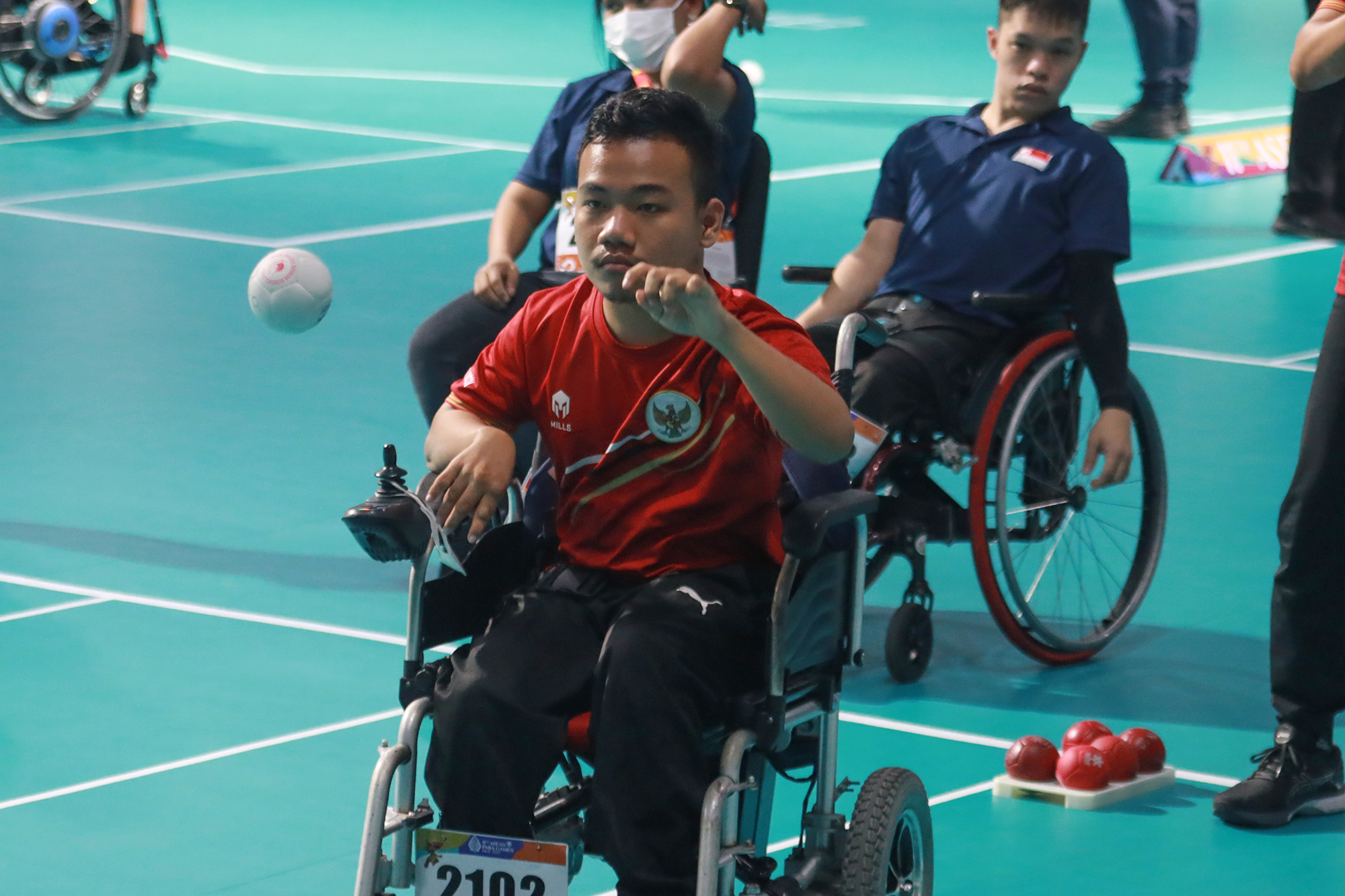 Atlet boccia Indonesia Muhamad Afrizal Syafa melakukan lemparan dalam pertandingan melawan Neo Kah Whyne asal Singapore di nomor Men’s Individual kelas BC1 cabang olahraga boccia. Pertandingan ini digelar di GOR Fakultas Olahraga UNS, Surakarta. Selasa, 2 Agustus 2022. Foto : HO/INASPOC/Sportsmoment/Agustinus Tri Mulyadi