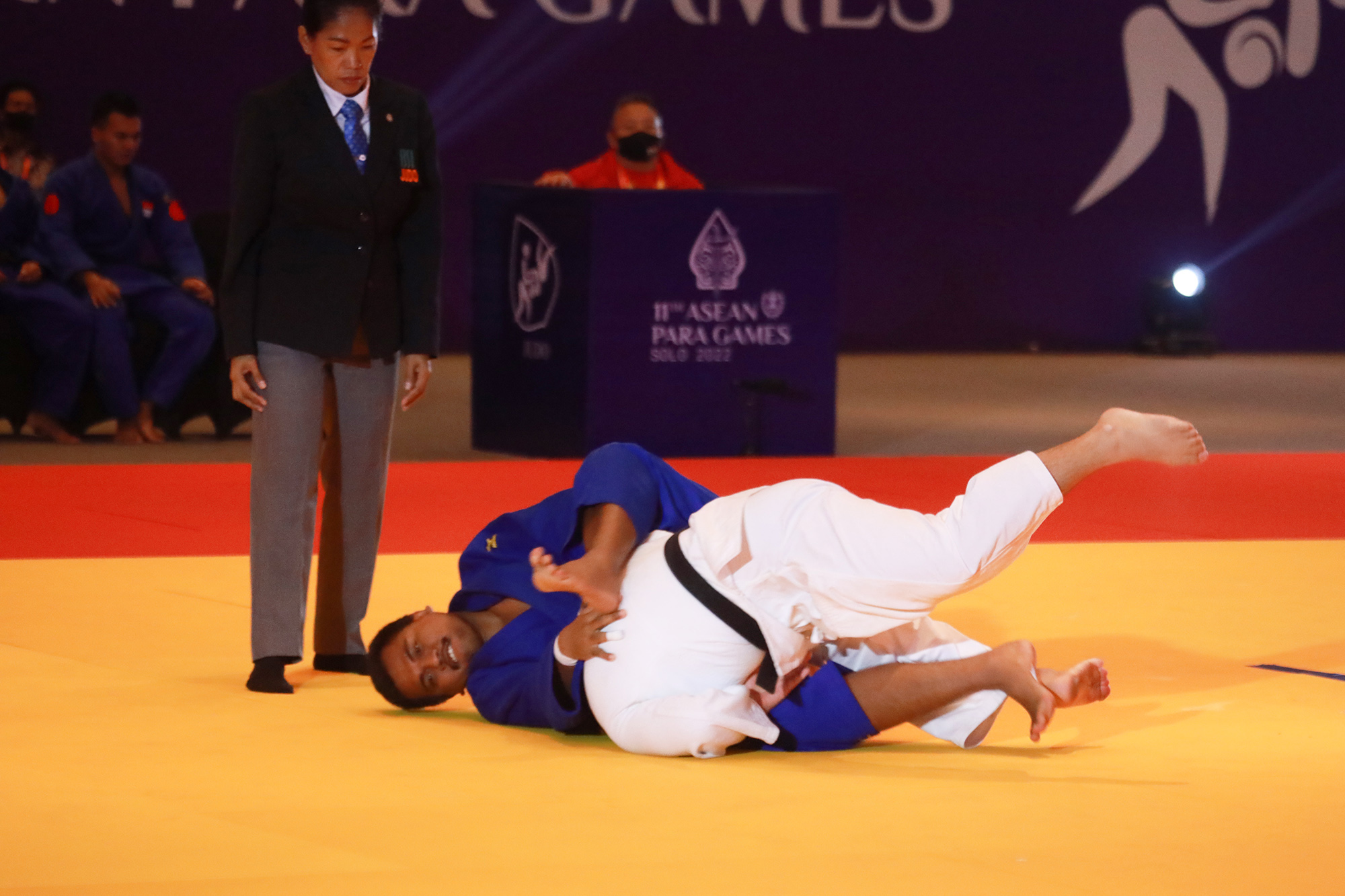 Atlet blind judo Putra Indonesia Mantolas Tony (biru), berhasil mengalahkan oleh Srijarung Sahas ( putih ) asal Thailand dalam kelas Round Robin +90 kg dalam laga 11th ASEAN Para Games 2022 di Tirtonadi Convention Hall, Kamis (4/8/2022). Foto : HO/INASPOC/Sportsmoment/Agustinus Tri Mulyadi