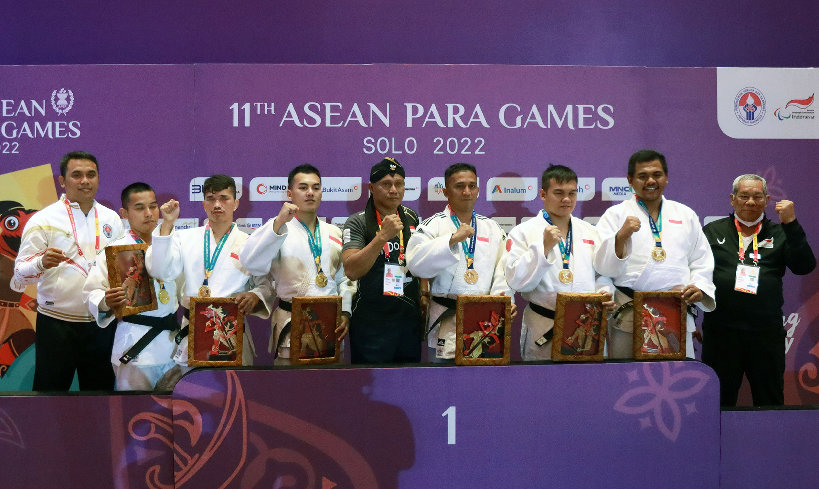 Team Putra Atlet Blind Judo Indonesia, berhasil meraih medali emas pada 11th ASEAN Para Games 2022 di Tirtonadi Convention Hall, Kamis (4/8/2022). Foto : HO/INASPOC/Sportsmoment/Agustinus Tri Mulyadi