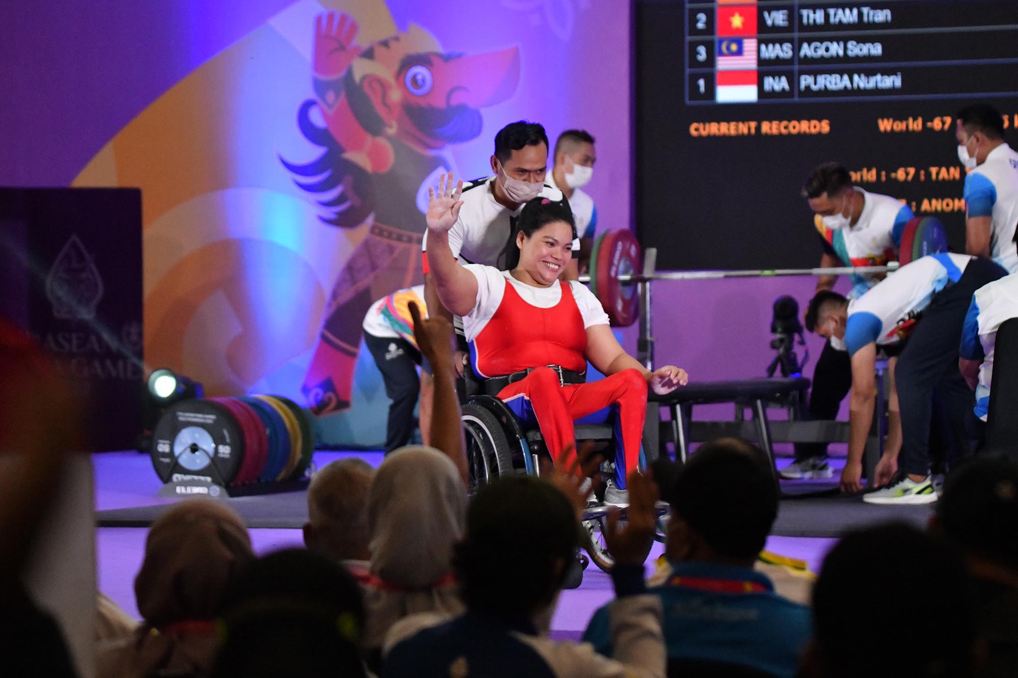 Lifter putri Nurtani Purba menyapa pendukung tim Indonesia dalam pertandingan para angkat berat 11th ASEAN Para Games 2022 di Hotel Paragon, Solo, Jawa Tengah, Kamis (4/8/2022). Nurtani berhasil meraih medali emas di nomor 73kg dengan angkatan 103kg.Foto : HO/INASPOC/Sportsmoment/Agung Wahyudi