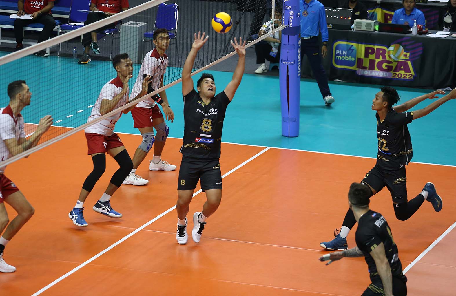 Jasen Natanael Kilanta (8) pemain bola voli Jakarta Pertamina Pertamax memberikan umpan bola ke rekannya.