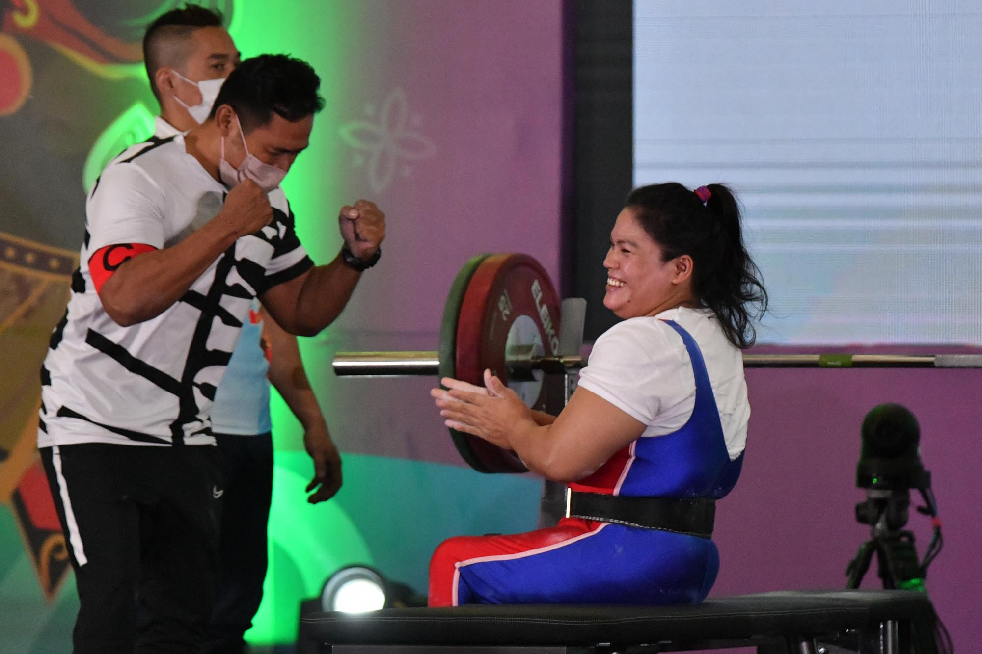 Lifter putri Nurtani Purba melakukan selebrasi bersama pelatihnya usai keberhasilannya mengangkat beban 103kg tim Indonesia dalam pertandingan para angkat berat 11th ASEAN Para Games 2022 di Hotel Paragon, Solo, Jawa Tengah, Kamis (4/8/2022). Nurtani berhasil meraih medali emas di nomor 73kg dengan angkatan 103kg.Foto : HO/INASPOC/Sportsmoment/Agung Wahyudi