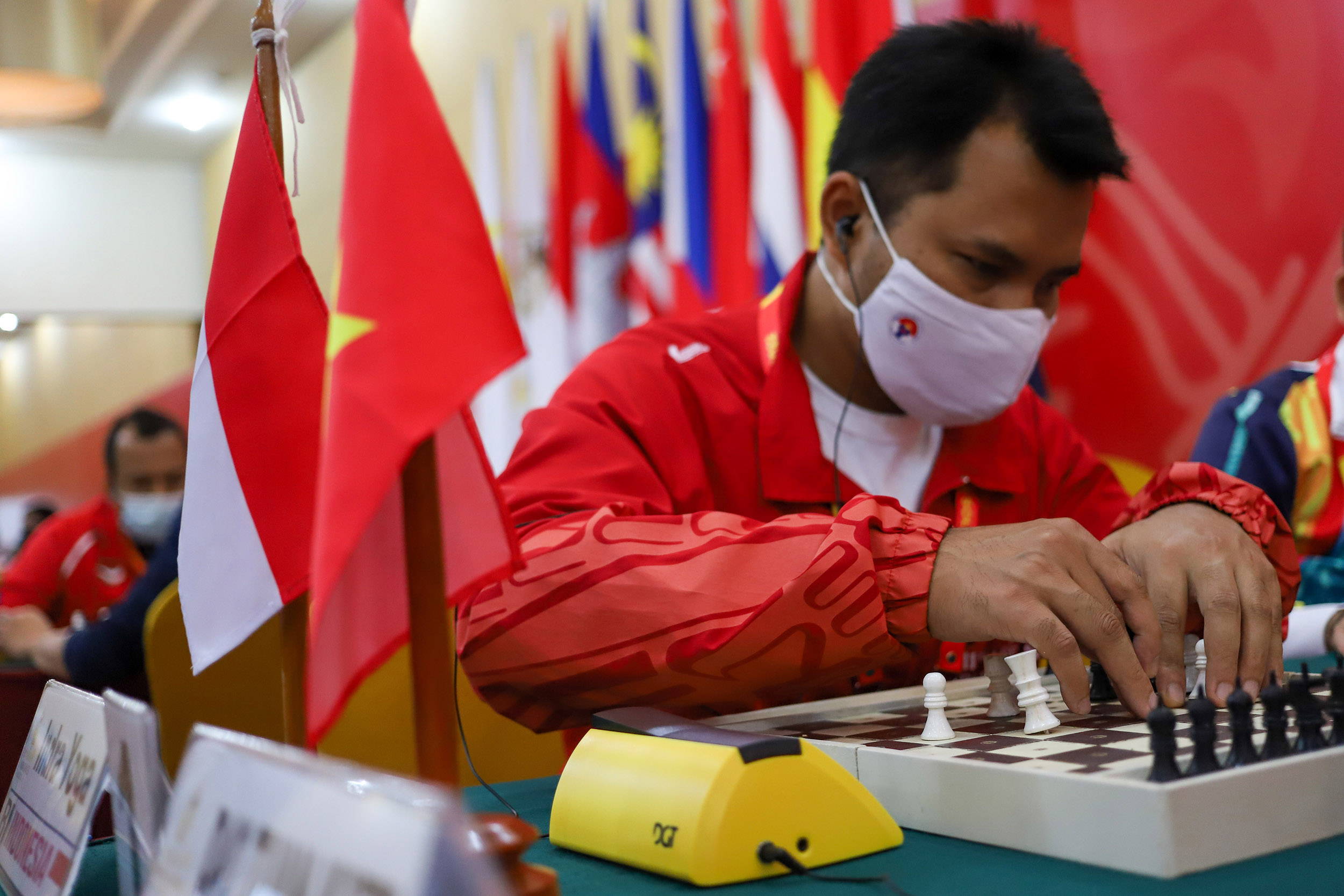 Indra Yoga VS Dao Tuan Kiet. Pecatur Indonesia Indra Yoga saat bertanding melawan pecatur Vietnam Dao Tuan Kiet pada kelas Men Individual Rapid Chess VI_B1 11th ASEAN Para Games 2022 di Lor In Hotel, Karanganyar, Jawa Tengah, Kamis (4/8/2022). Foto : HO/INASPOC/Sportsmoment/Muhamad Solihin.