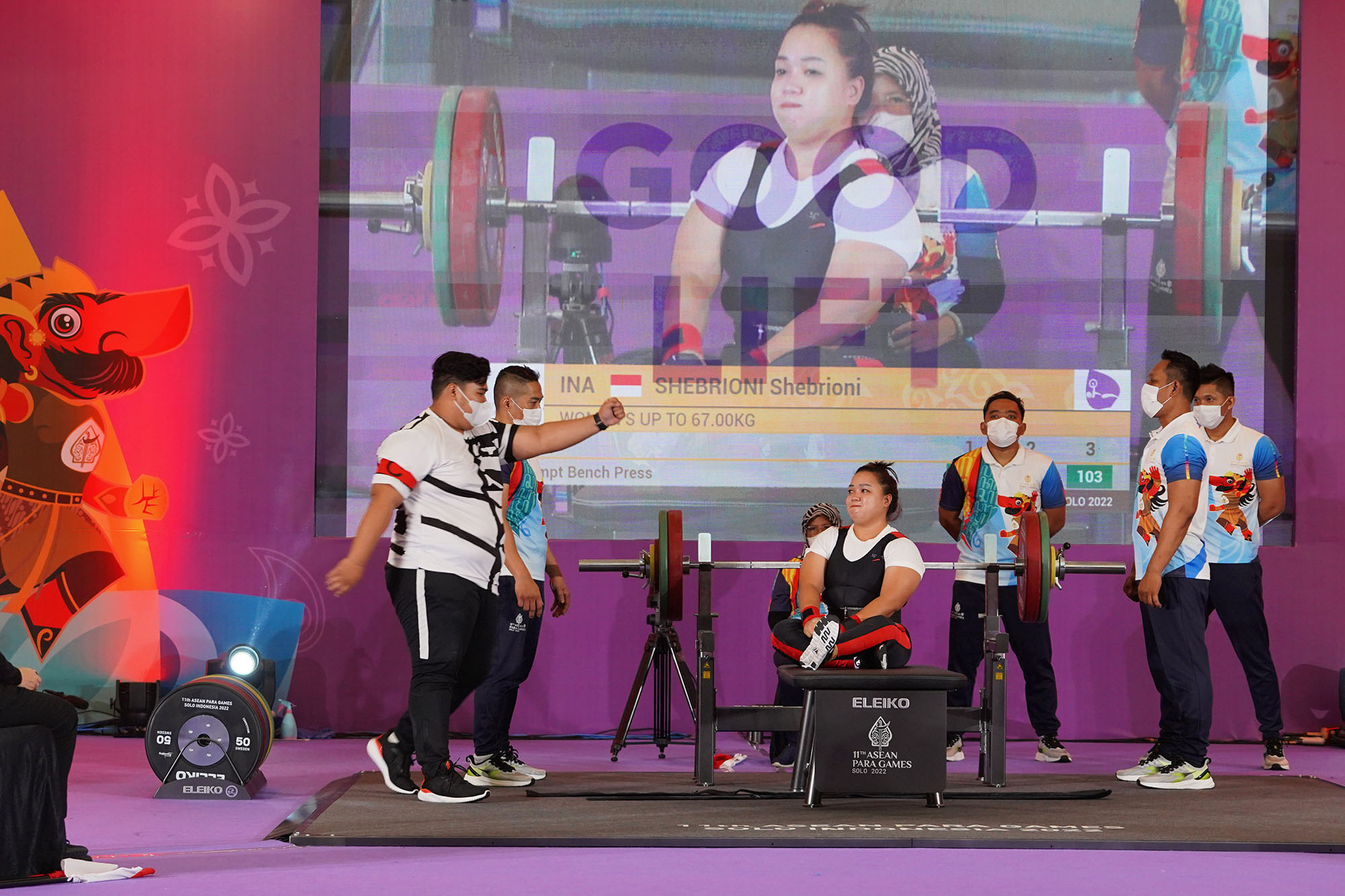 Atlet power lifting asal kota kembang Bandung Shebrioni sukses merebut dua medali emas dan memecahkan rekor angkatan terbaik APG di kelas 67 kg atas nama atlet Thailand, Somkhoun Anon sebesar 95 kg. Pertandingan seru dan menegangkan itu berlangsung di hotel Paragon, Solo, Jawa Tengah (4/8/2022). Foto : HO/INASPOC/Sportsmoment/Tandur Rimoro