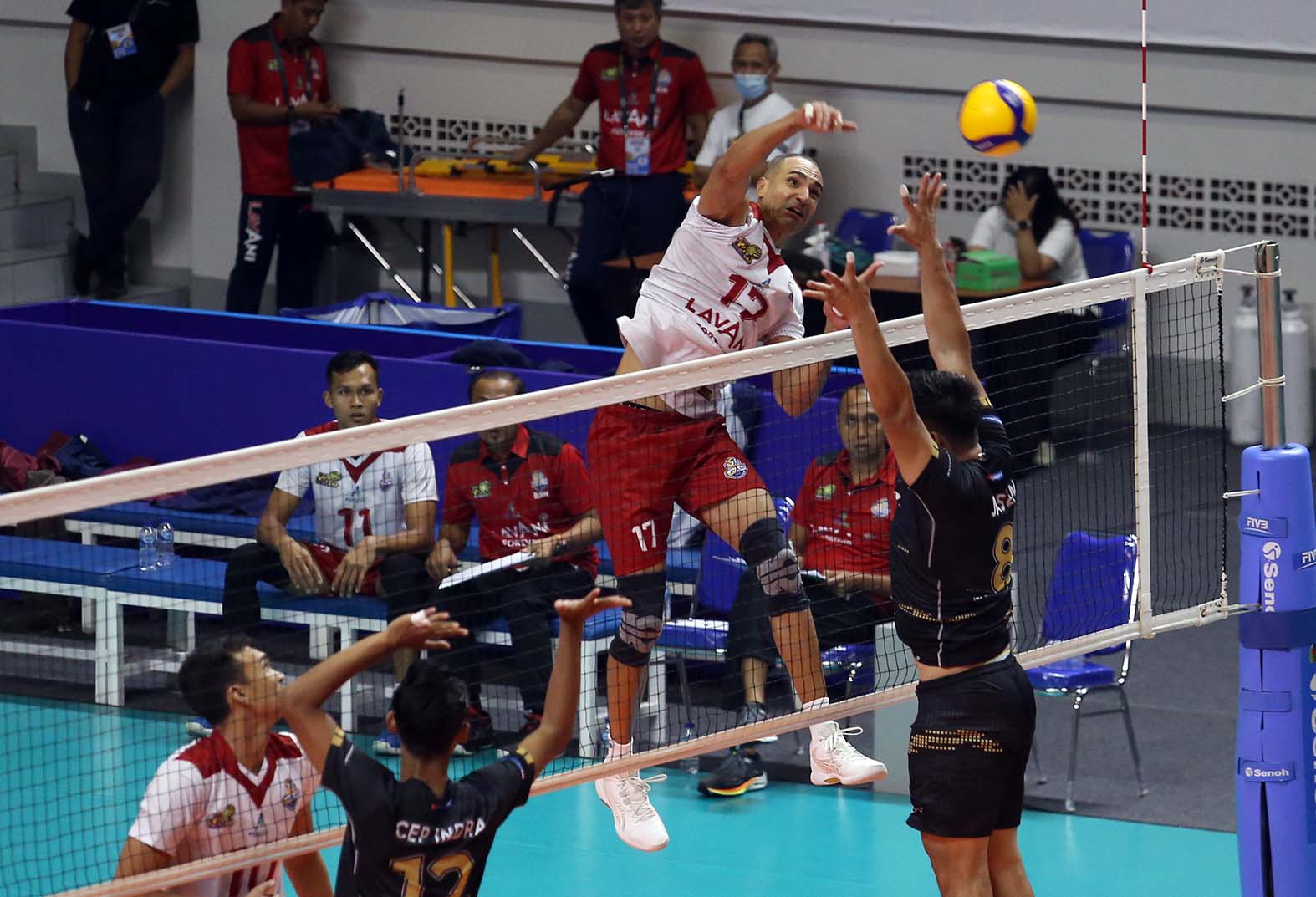 Jorge Gonzales Garcia (17) tim bola voli putra Bogor Lavani mengarahkan pukulan smashnya ke area lawan.