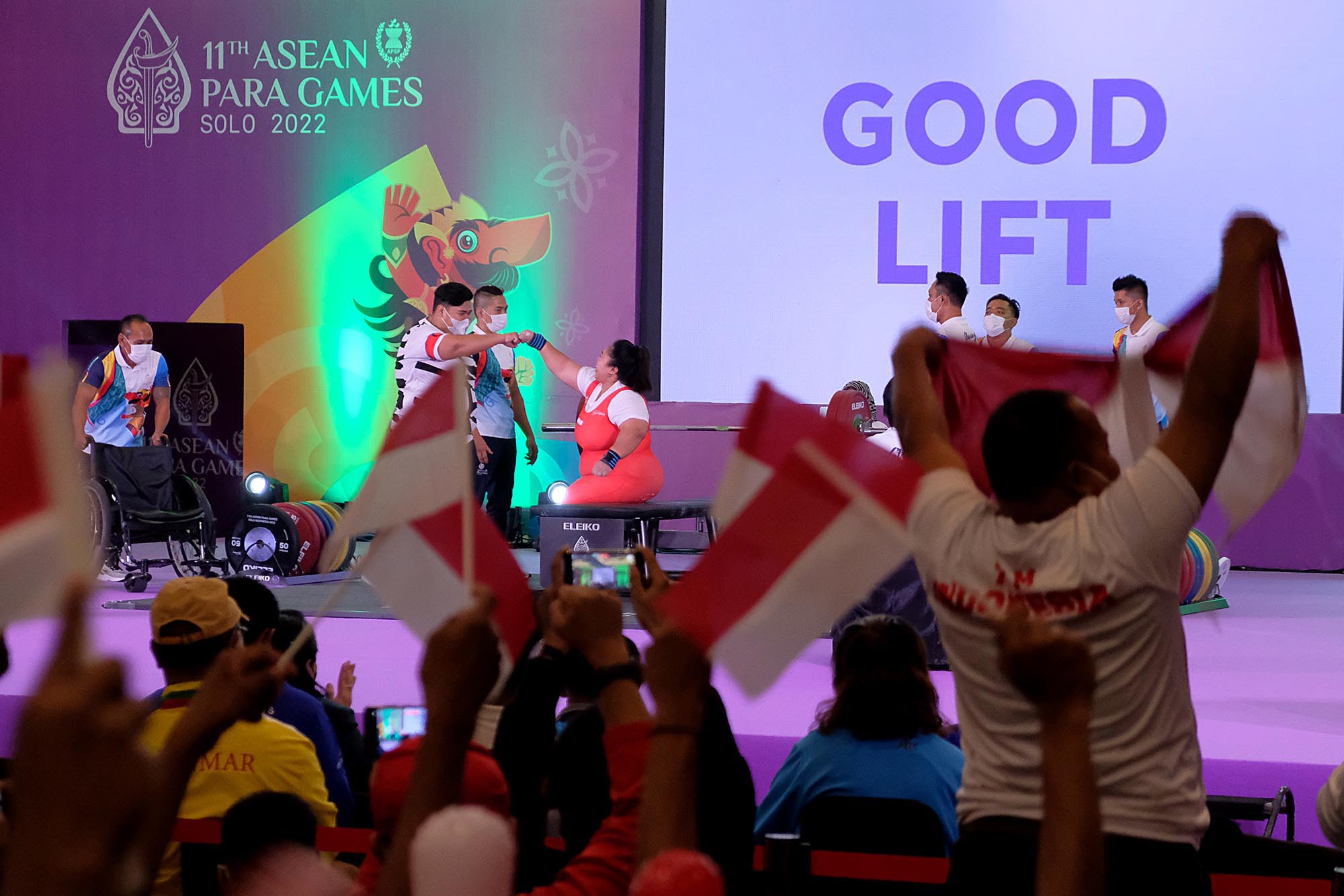 Pendukung bersorak saat lifter putri Indonesia Sriyanti berhasil mengangkat beban sebesar 127kg dan meraih medali emas di nomor angkat berat putri +86kg ASEAN Para Games 2022 di Paragon Hotel, Solo, Jawa Tengah, Kamis (4/8/2022), Foto : HO/INASPOC/Sportsmoment/Agung Wahyudi