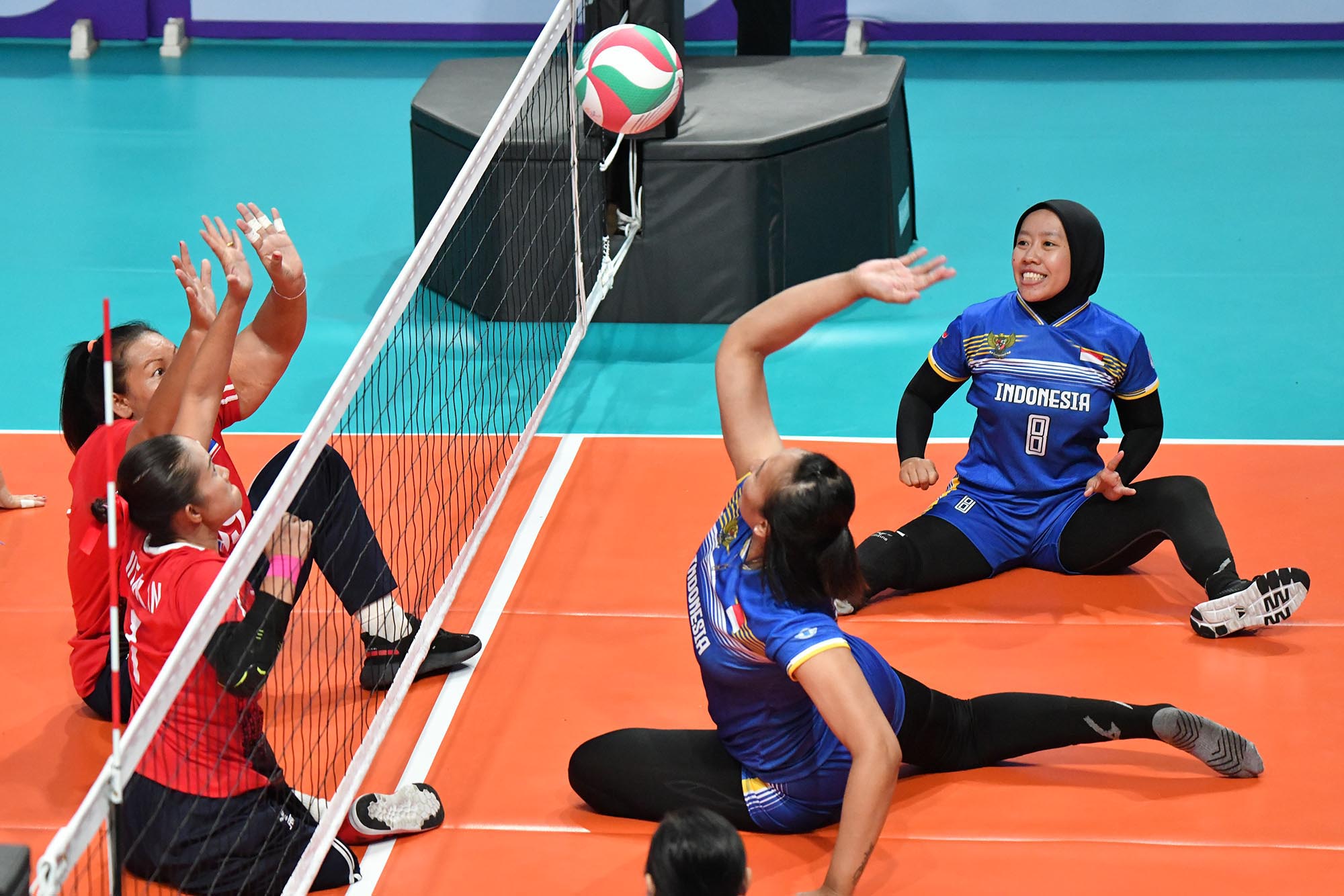 Alet voli duduk Indonesia Anissa Tindy Lestary melakukan pukulan smas ke arah tim thailand dalam pertandingan bola voli duduk 11th ASEAN Para Games 2022 di GOR UTP Karanganyar, Jawa Tengah (Kamis 4/8/2022). Indonesia menang tiga set langsung dengan skor 25-12, 25-10, dan 25-6.Foto : HO/INASPOC/Sportsmoment/Agung Wahyudi