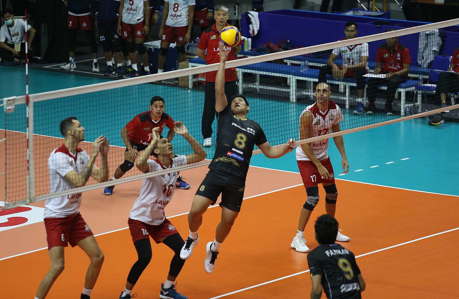 Jasen Natanael Kilanta (8) pemain bola voli Jakarta Pertamina Pertamax memberikan umpan bola ke rekannya.