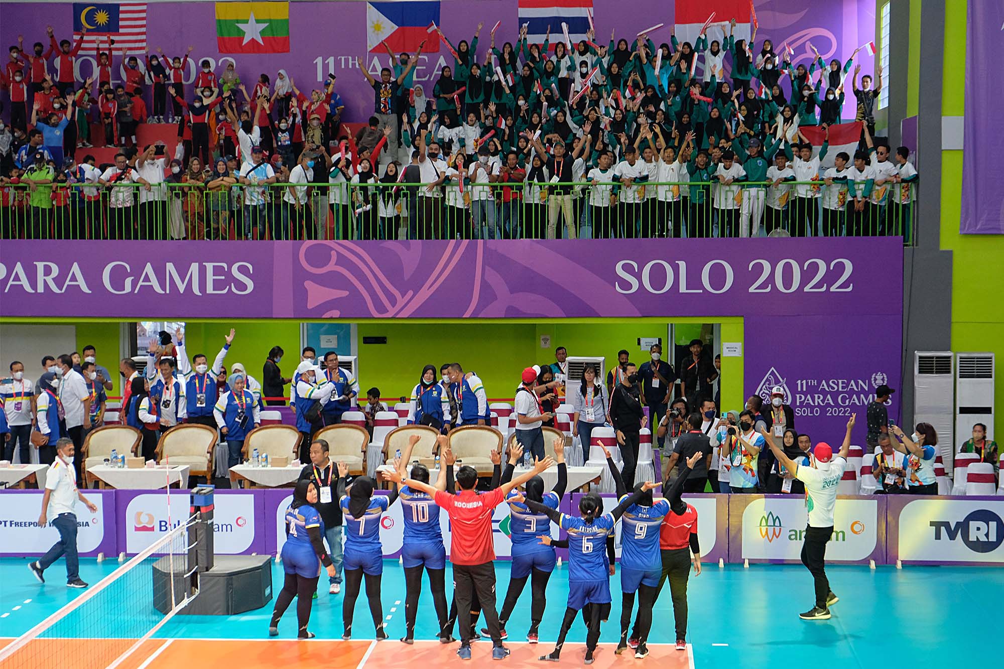 Pemain bola voli duduk putri Indonesia menyapa suporter yang telah mendukung dalam pertandingan melawan Thailand dalam 11th ASEAN Para Games 2022 di GOR UTP Karanganyar, Jawa Tengah, Kamis (4/8/2022). Foto : HO/INASPOC/Sportsmoment/Agung Wahyudi