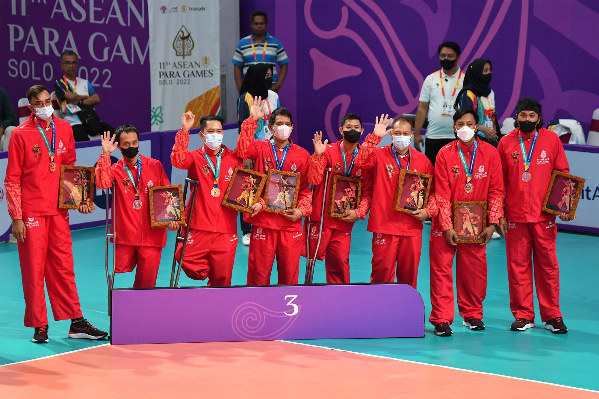 Tim bola voli duduk putra Indonesia melakukan selebrasi setelah pengalungan medali perunggu di ajang 11th ASEAN Para Games 2022 di GOR UTP Karanganyar , Jawa Tengah, Kamis (3/8/2022). Foto : HO/INASPOC/Sportsmoment/Agung Wahyudi