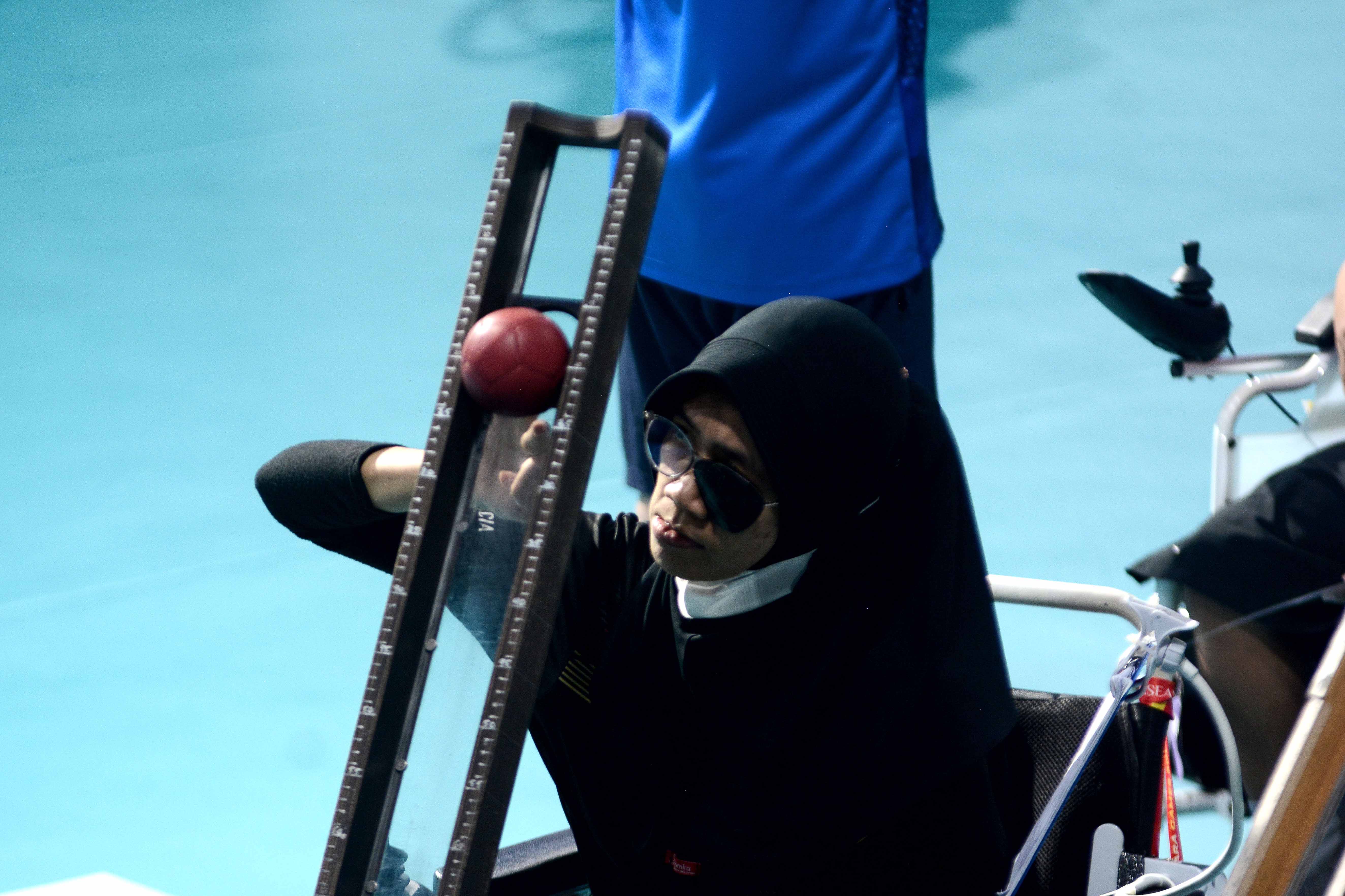 Atlet Boccia Indonesia Suci Kirana Dewi melempar bola saat menghadapi Atlet Boccia Thailand pada ASEAN Paragames 2022 nomor PAIRS BC 3 , di FKOR UNS Sports, Solo, Jawa Tengah, Kamis (4/8).Indonesia Kalah dengan Skor 2-0,3-0, 3-0, 01. Foto : HO/INASPOC/Sportsmoment/Yoma Times Suryadi.