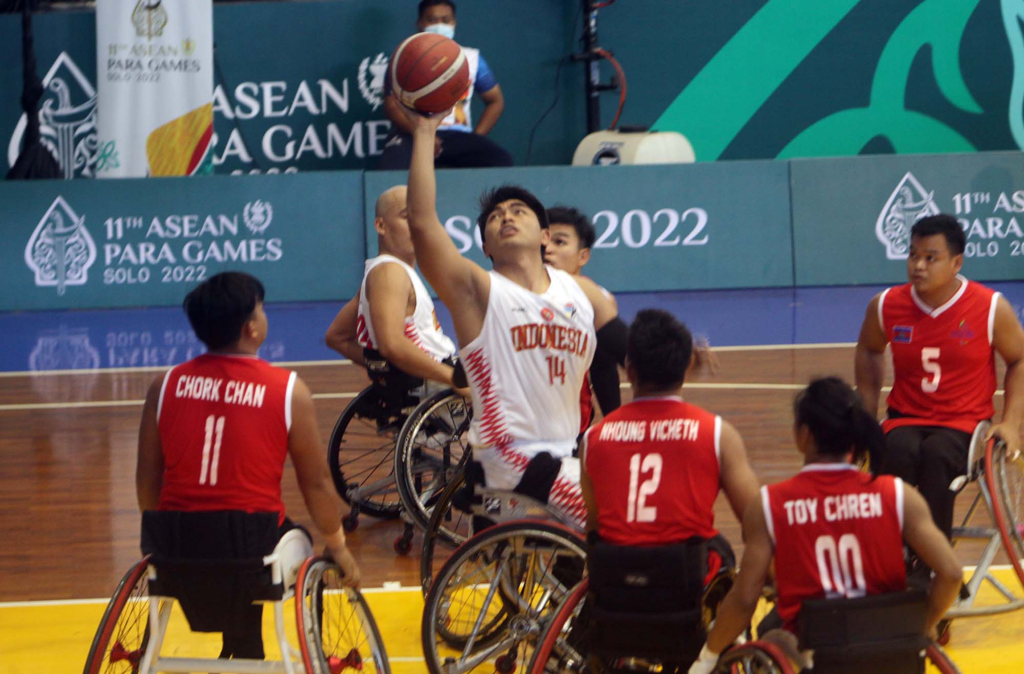 Pemain Bola Basket Kursi Roda putra Indonesia, I Komang Suparta berusaha memasukan bola kekeranjang lawan di cabang Wheelchair Basketball 5X5 11th ASEAN Para Games Solo 2022 di GOR Sritex Arena (3/8/2022), Tim Indonesia mengalahkan tim Kamboja dengan skor 61-35. Foto : HO/INASPOC/Sportsmoment/Husni Yamin.