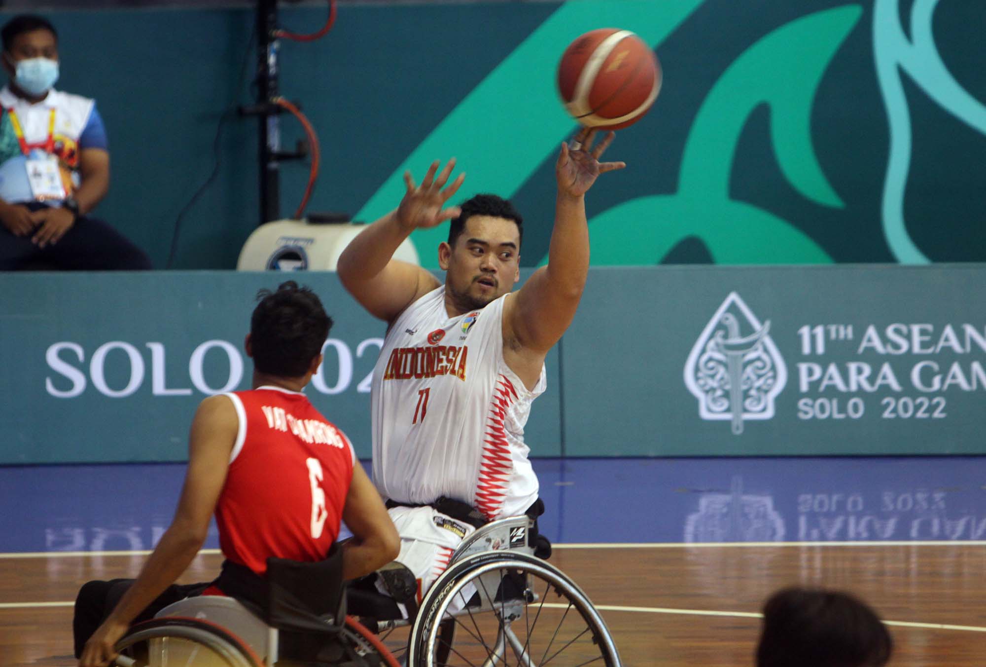 Pemain Bola Basket Kursi Roda putra Indonesia, Kasep Ayatulloh berusaha memasukan bola kekeranjang lawan di cabang Wheelchair Basketball 5X5 11th ASEAN Para Games Solo 2022 di GOR Sritex Arena (3/8/2022), Tim Indonesia mengalahkan tim Kamboja dengan skor 61-35. Foto : HO/INASPOC/Sportsmoment/Husni Yamin