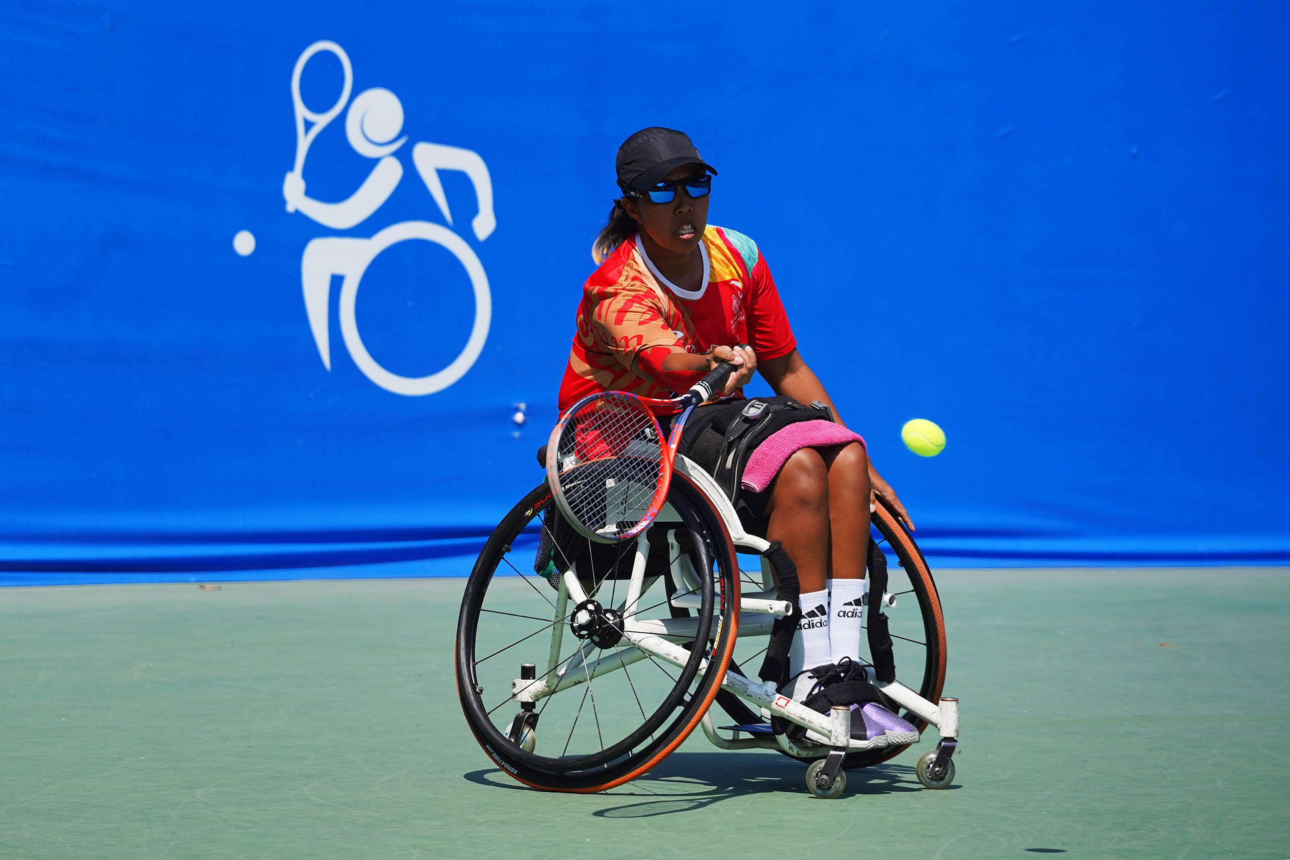 Atlet Wheelchair Tennis andalan Indoneisa Ndaru Padma Putri saat mengembalikan bola dari lawannya Sakom Khantasit Thailand. Pertandingan wheelchair tennis single putri yang di laksanakan di Manahan Tennis Center Surakarta, (04/08/2022) ini di menangkan Sakom Khantasit Thailand dan andalan Indonesia Ndaru Padma Putri harus puas di urutan ke dua dan mendapatkan medali perak. Foto : HO/INASPOC/Sportsmoment/Tandur Rimoro